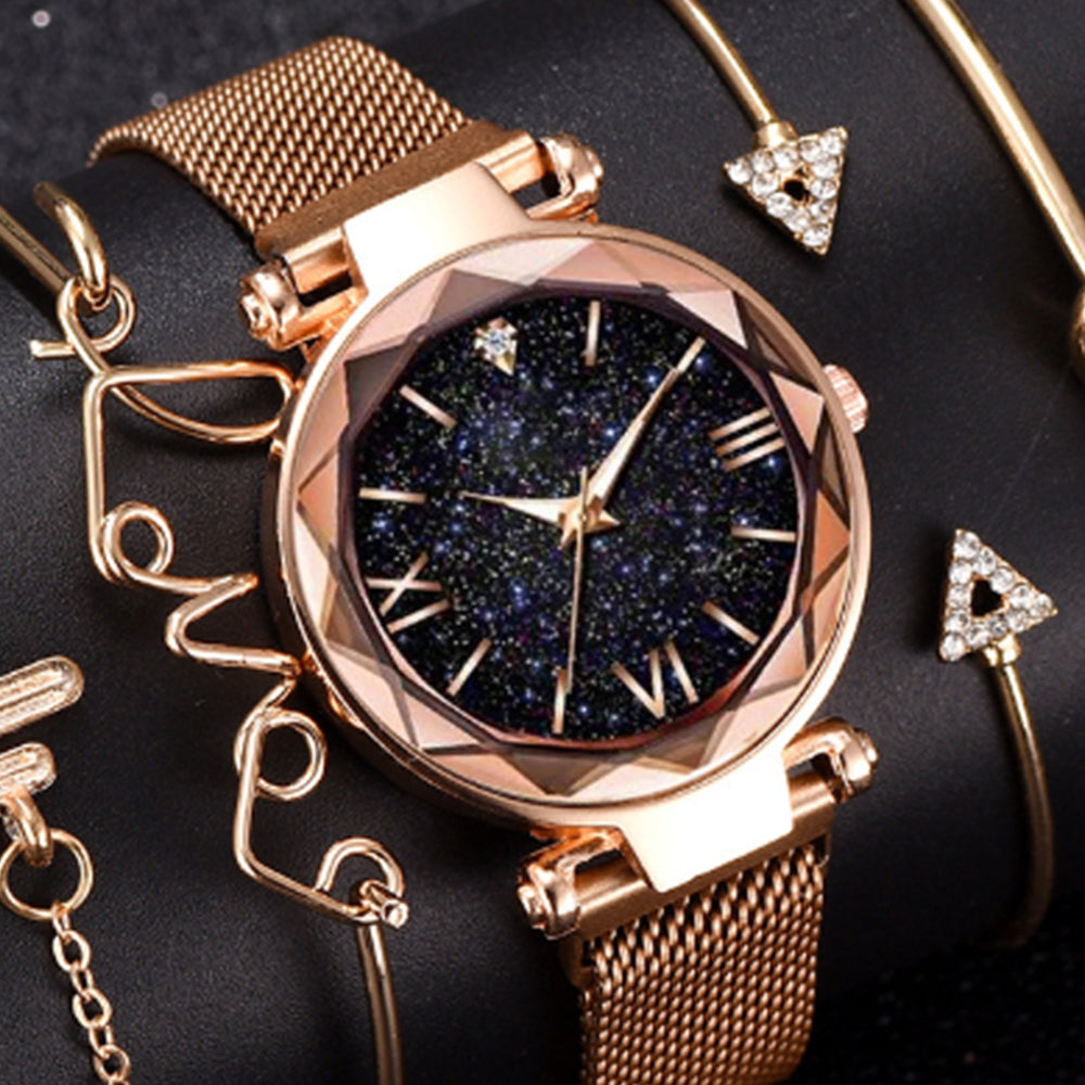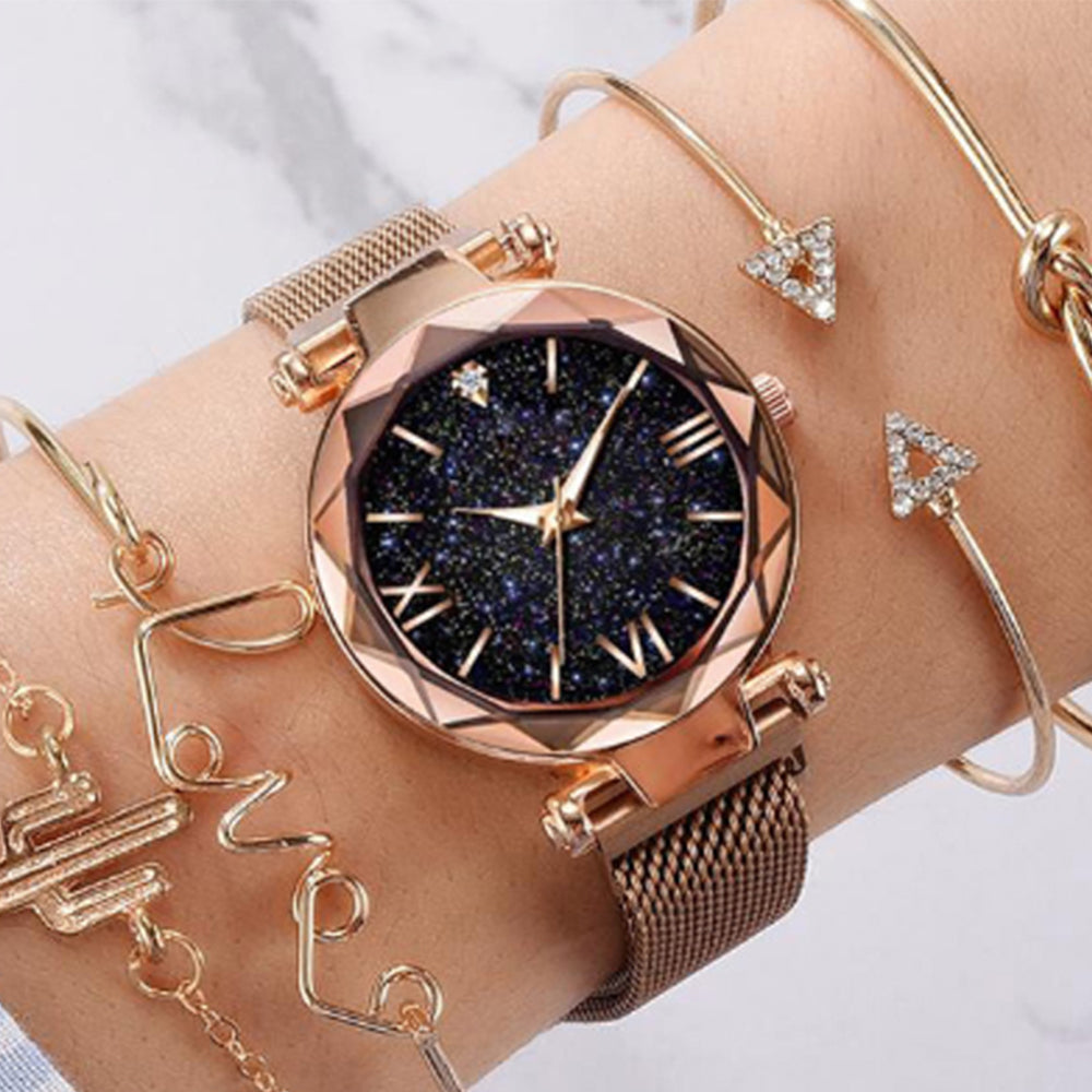Women Watch and Bracelet Set Magnet Buckle Watch Quartz Wristwatch Bracelet Set Fashion Accessories for Women Girls