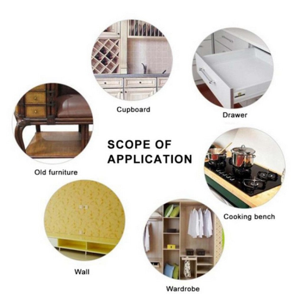 Could be apply for kitchen cabinets, countertop, shelves, walls and other smooth surface.