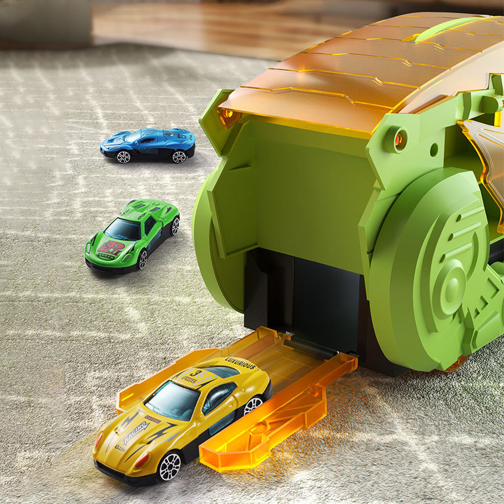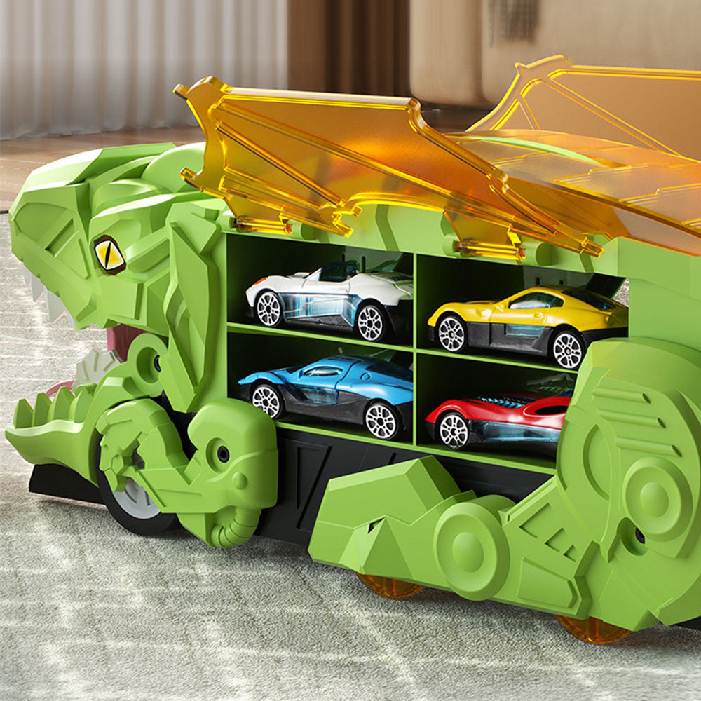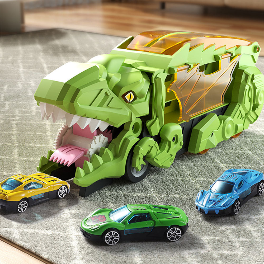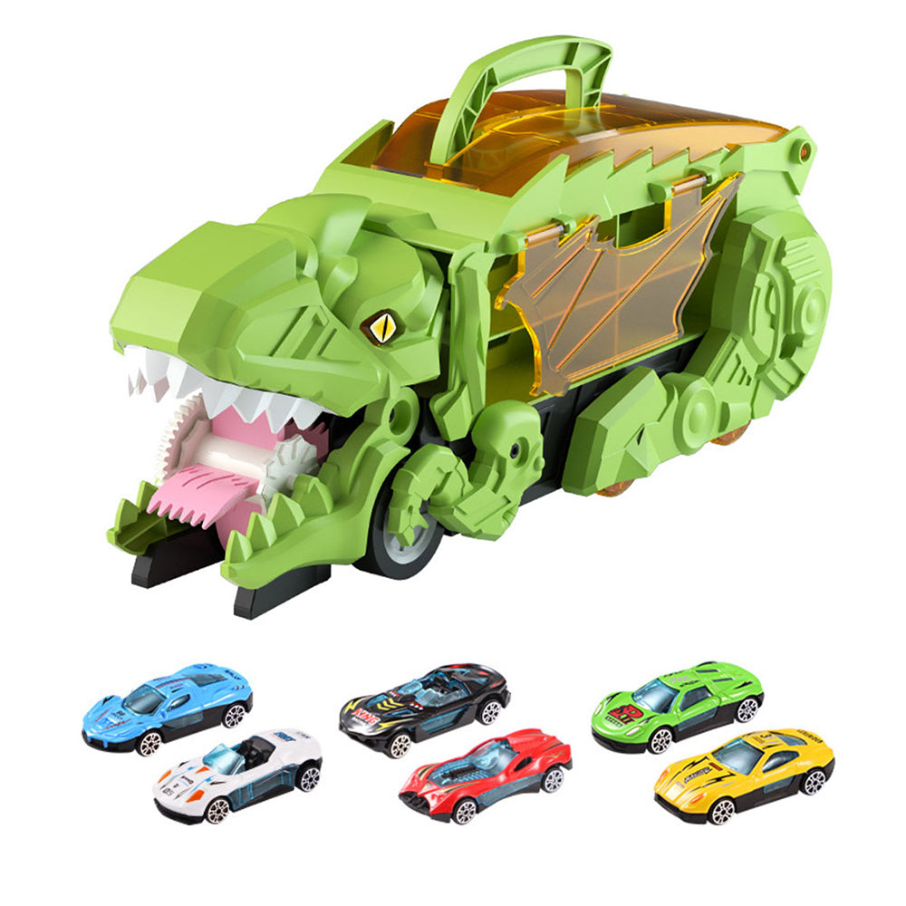- This dinosaur truck toy can swallow 6 small cars on the road, and then the small cars can slide out from the open tailgate, simulating a car escape scene.
