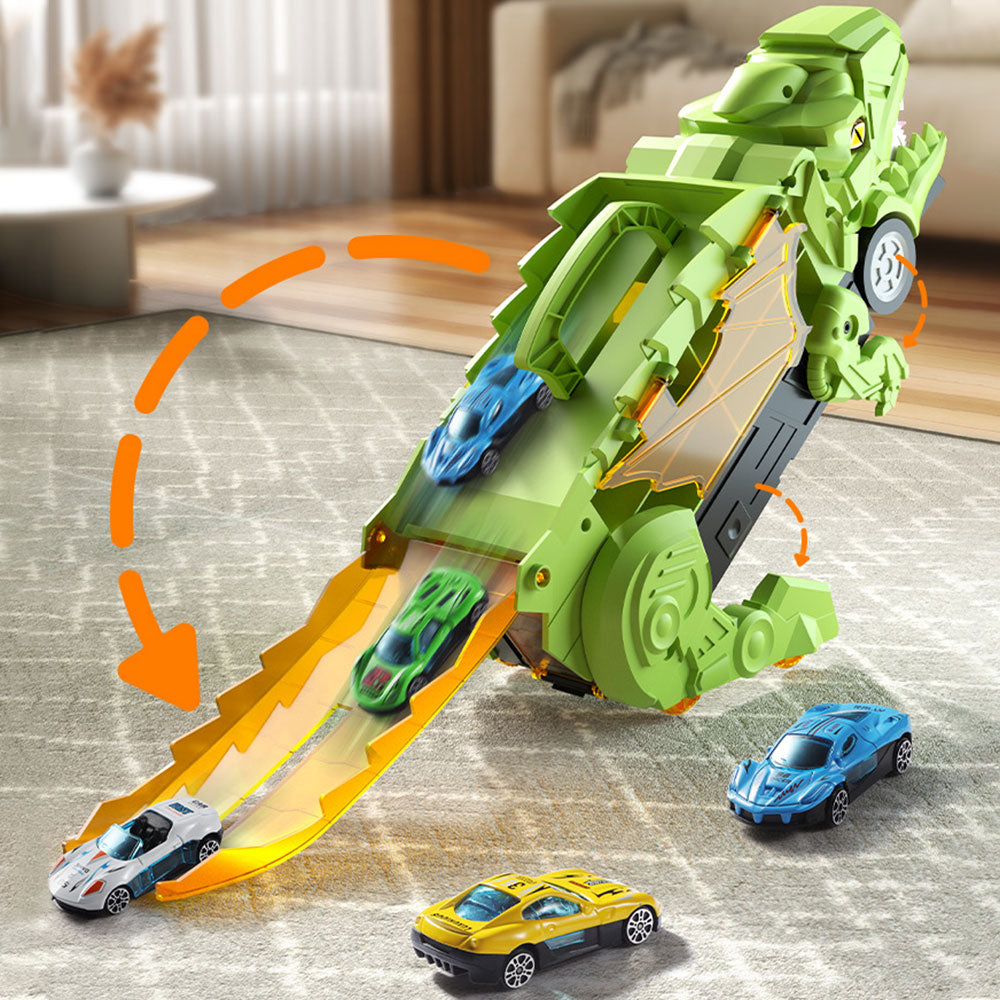 - This toy can turn into a cool upright dinosaur with 2 tracks for small racing car races to see who can slide faster and bring excitement and fun to kids.
