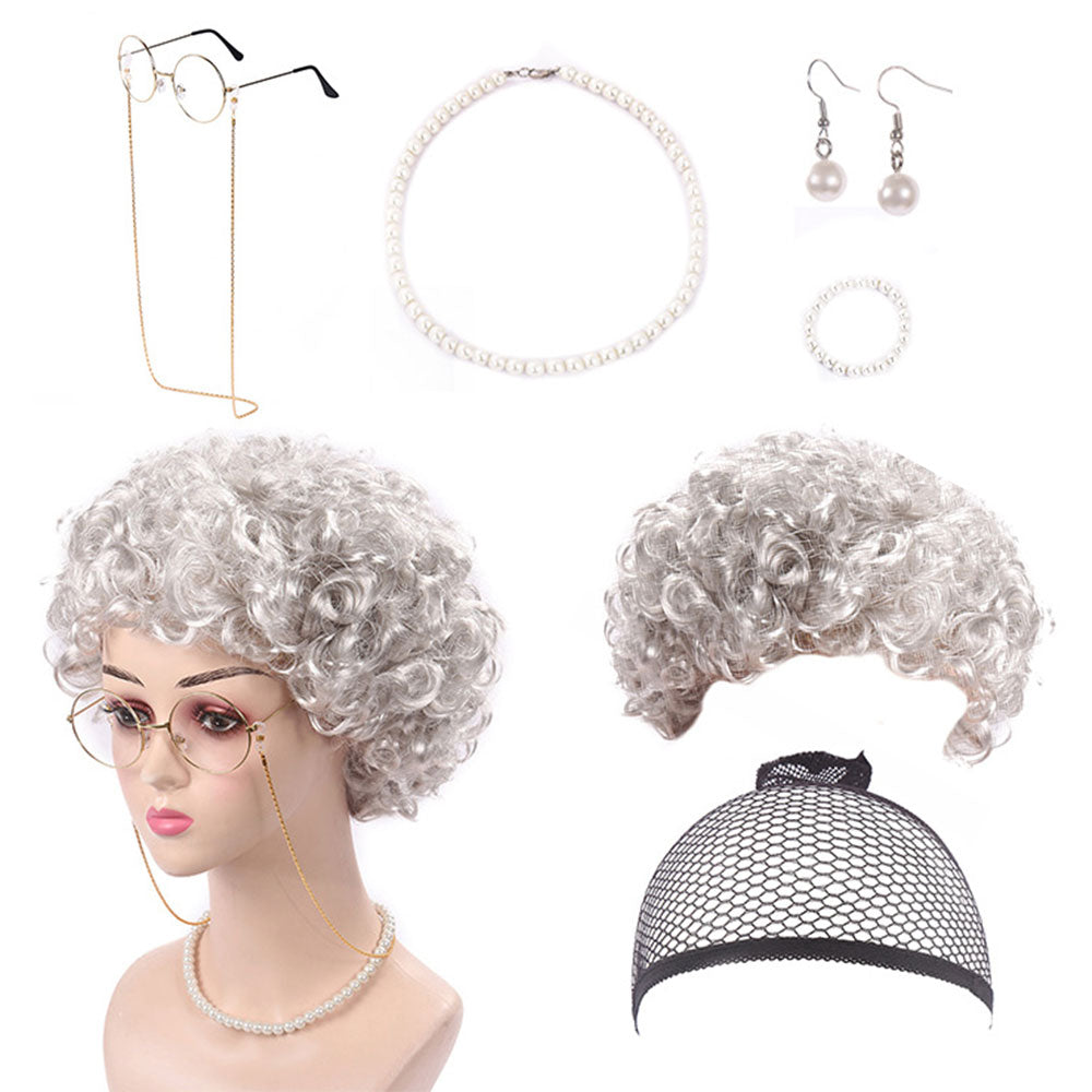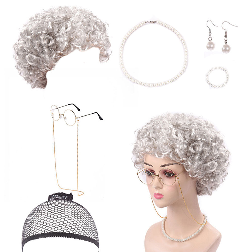 - Includes an old lady wig, wig net, granny glasses with eyeglass chains strap, necklace, bracelet, and a pair of earrings for a complete and authentic look.
