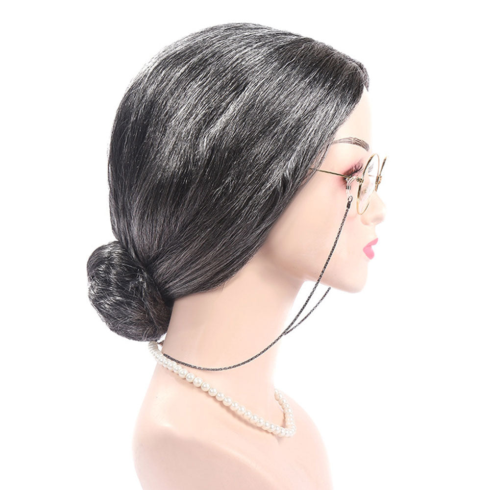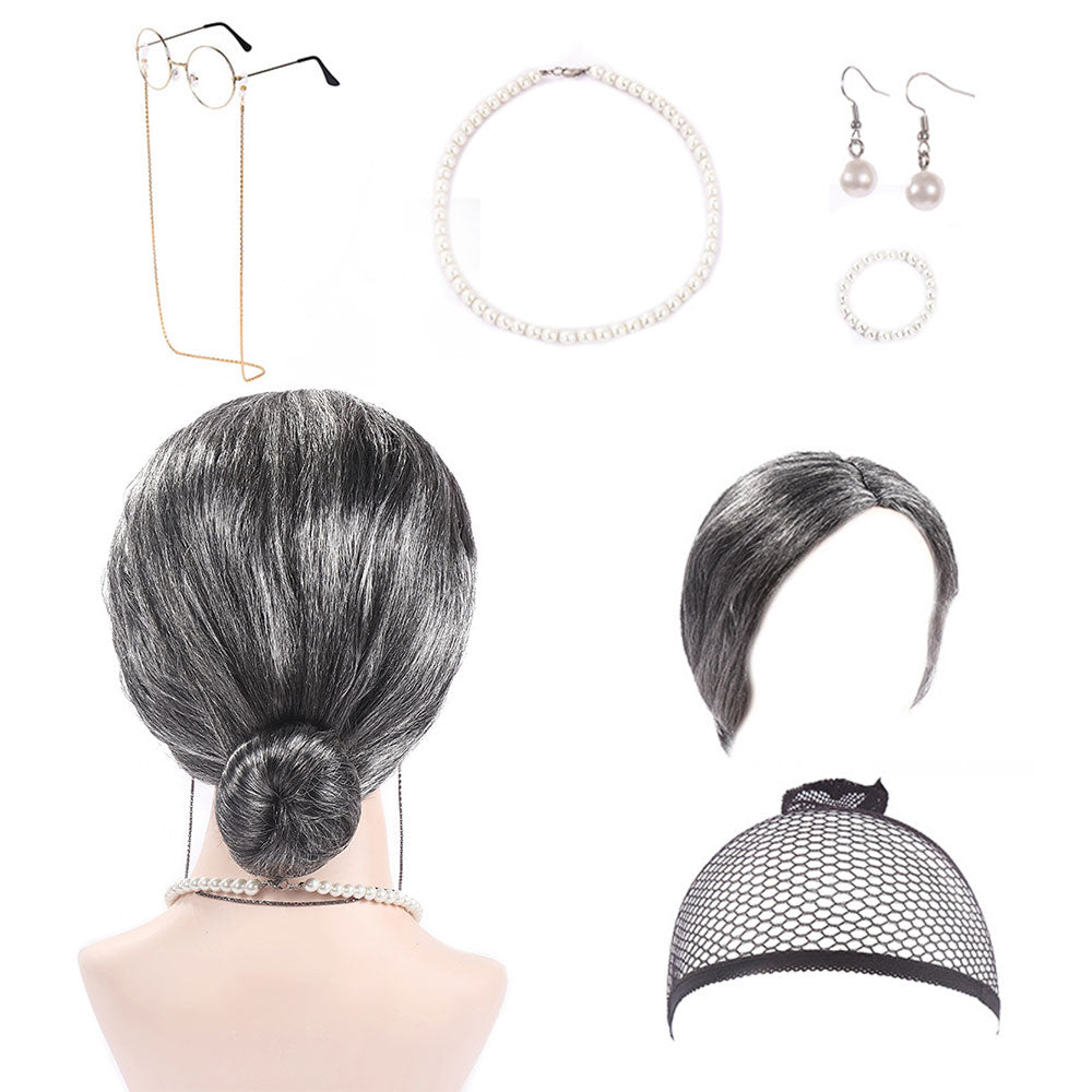 - Includes an old lady wig, wig net, granny glasses with eyeglass chains strap, necklace, bracelet, and a pair of earrings for a complete and authentic look.