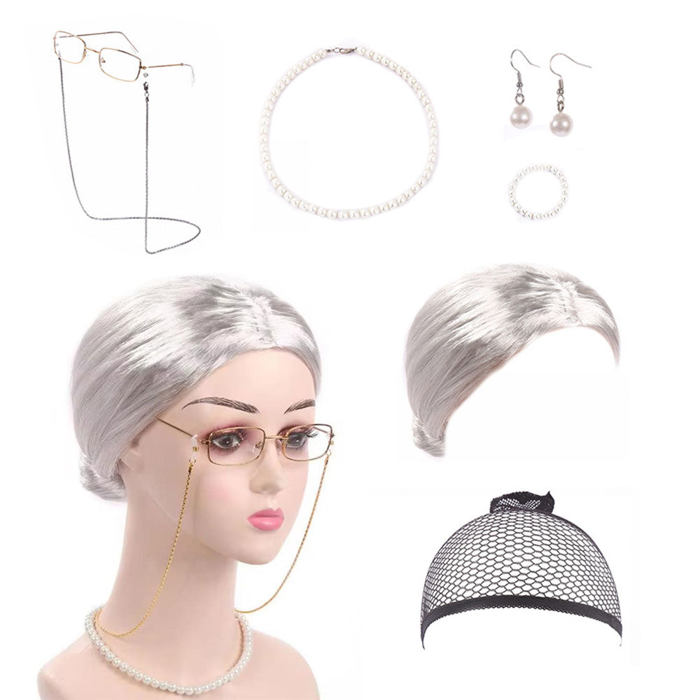 - Includes an old lady wig, wig net, granny glasses with eyeglass chains strap, necklace, bracelet, and a pair of earrings for a complete and authentic look.