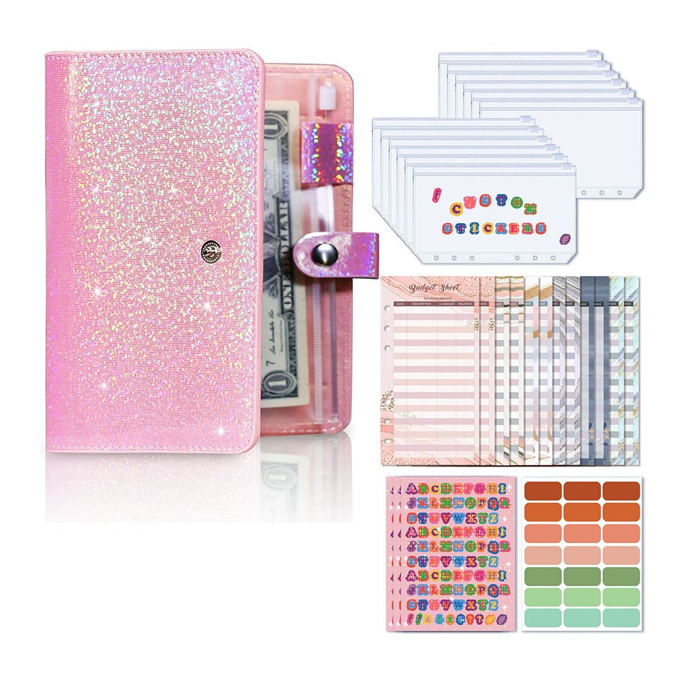 A6 PU Leather Notebook Binder Budget Planner Organizer Cover Cash Pockets Sheets Pink