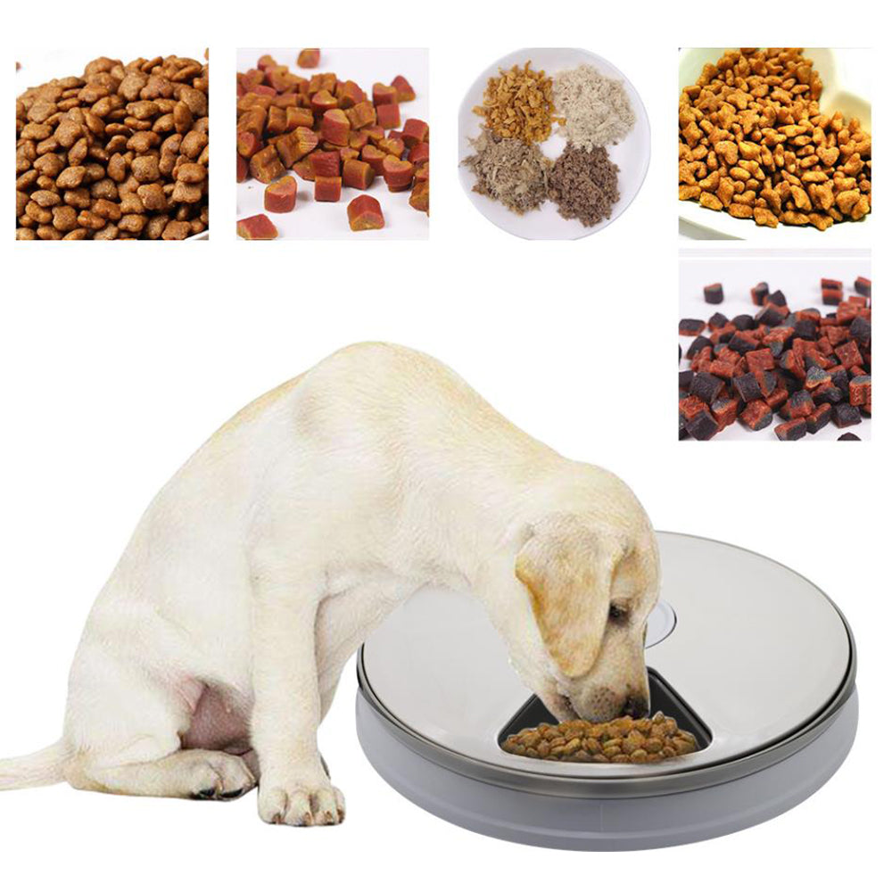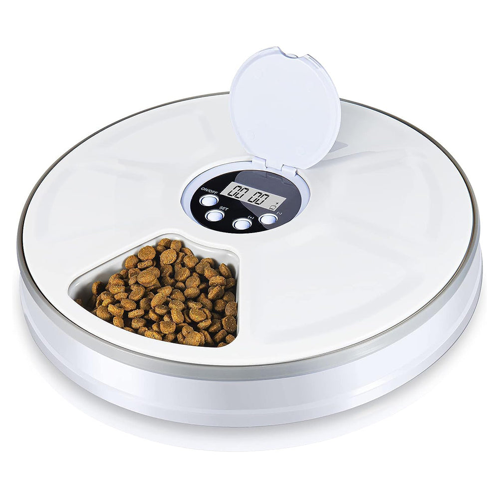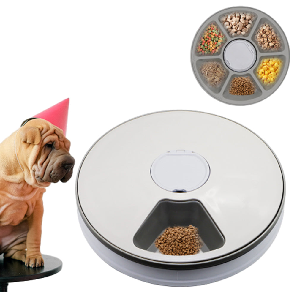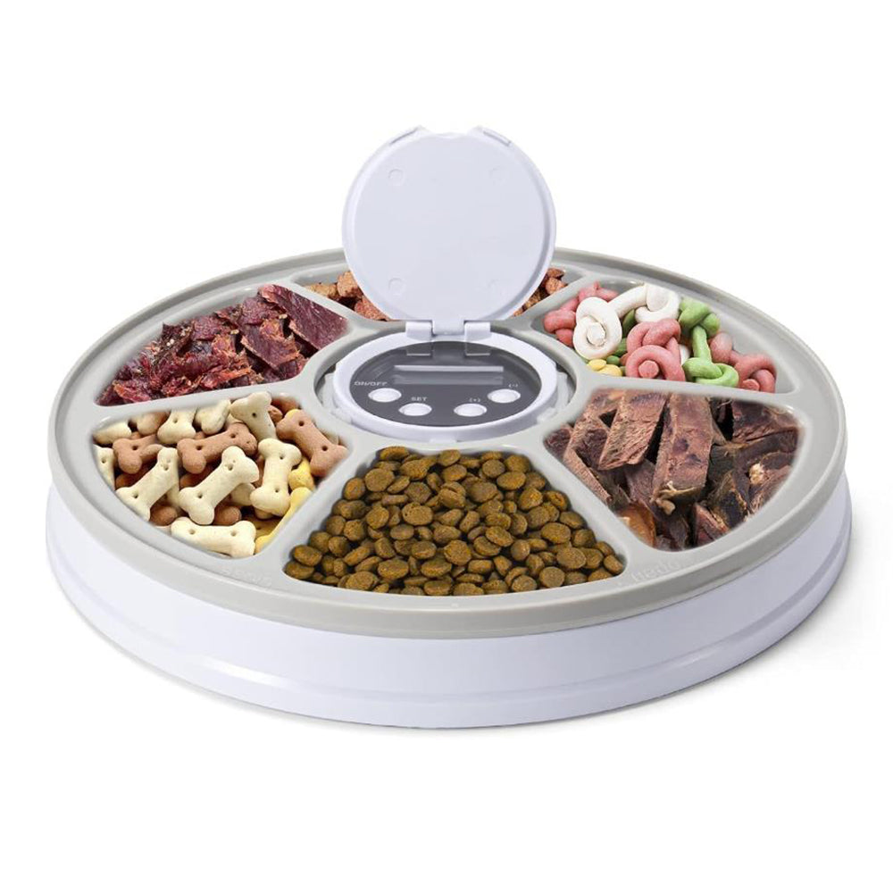 An automatic feeder with six compartments, rotating at timed intervals for precise and scheduled pet feeding.