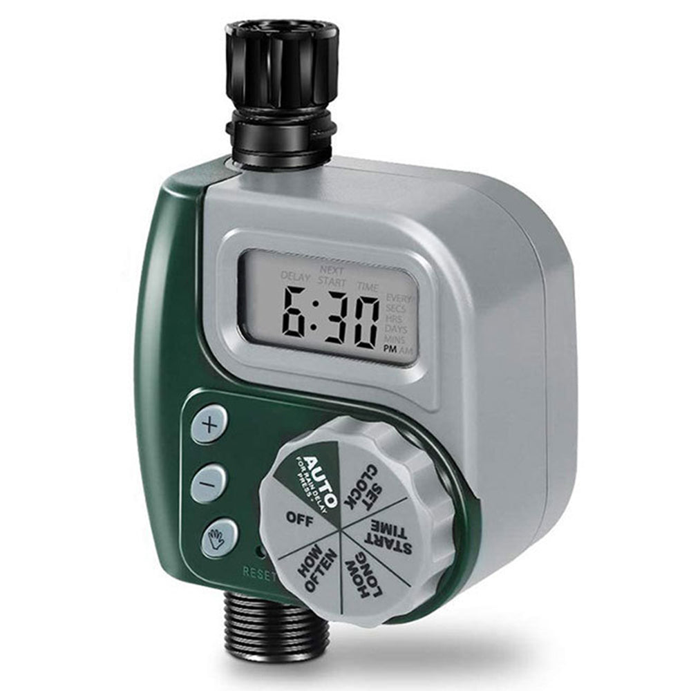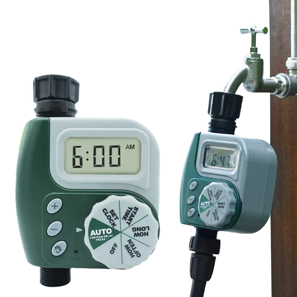 The automatic watering timer manages your garden's irrigation schedule, ensuring precise and timely watering to keep your plants healthy, even when you're away from home.
