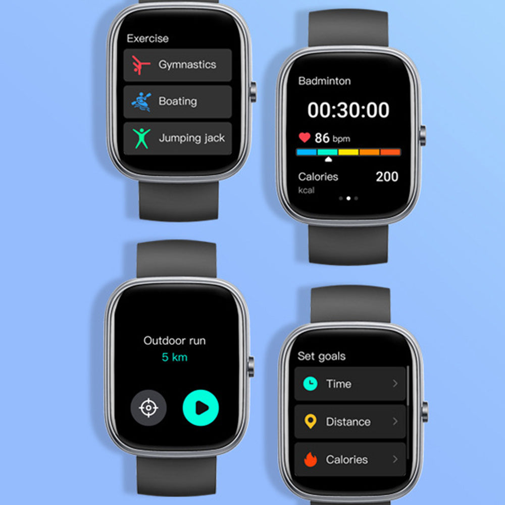 - Multifunctional design, includes alarm, stopwatch, timer, calculator, weather forecast, stand-up reminder, water reminder, find phone feature, camera control, calendar, and breath training.
