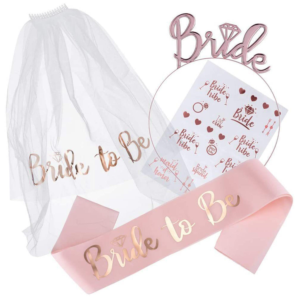 - Set includes 1bride sash, 1 bride tiara, 1 bride veil with comb, 1 bride tattoo.