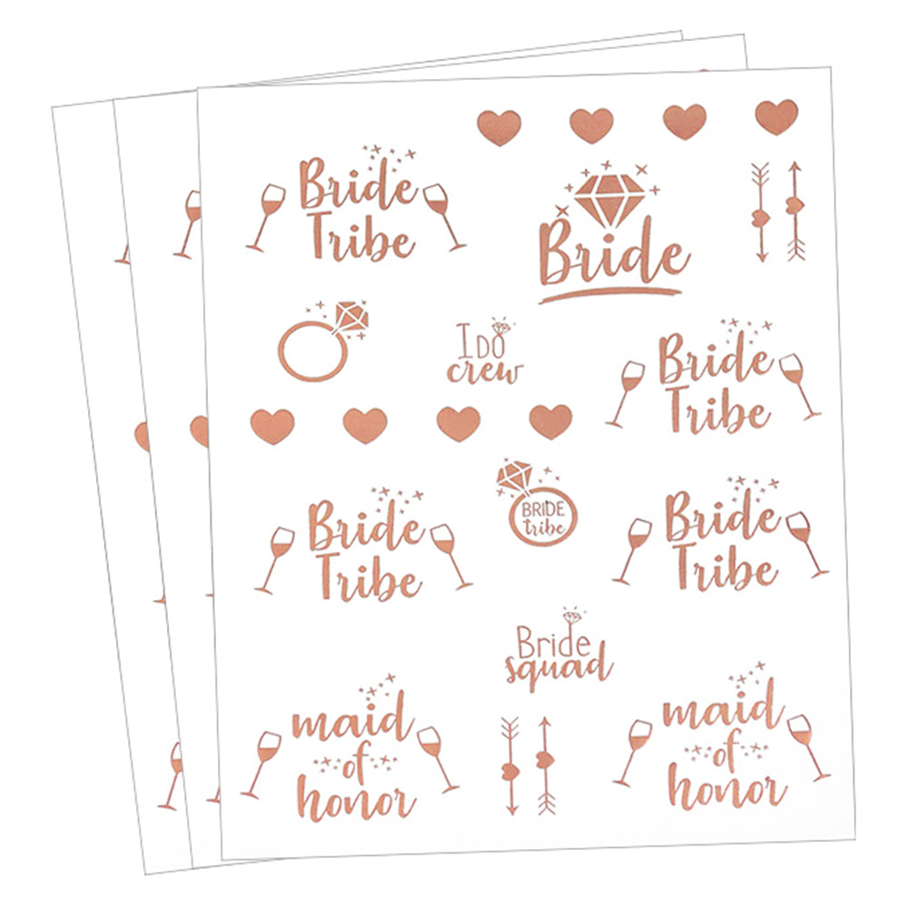 - Temporary rose gold tattoos featuring bride tribe, bride, extra diamond ring, and heart designs, you can pass one out to everyone and get the bride party started.