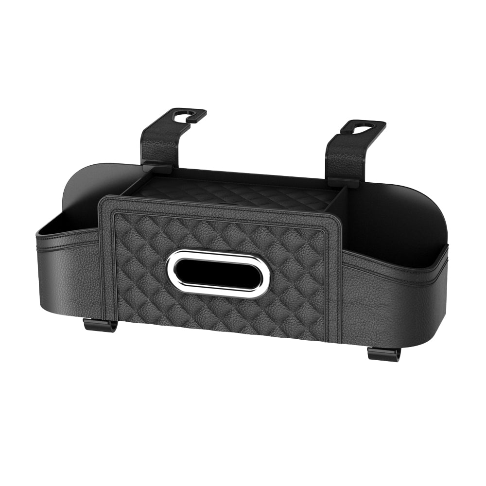 This car back seat organizer features a built-in tissue box, cup holders and hook to keep all your essentials within reach.