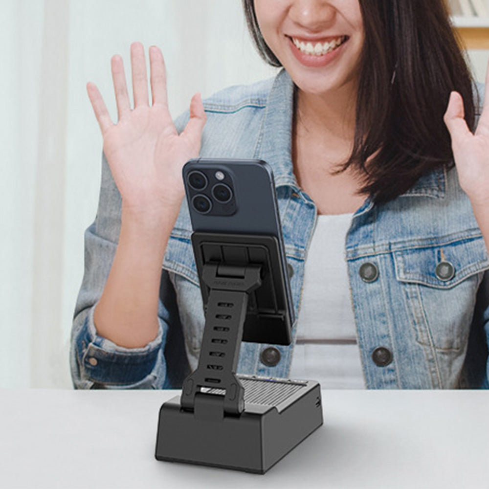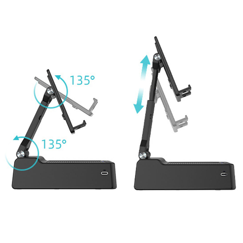 - A dedicated charging port is available at the bottom of the stand, allowing for vertical or horizontal use while charging.