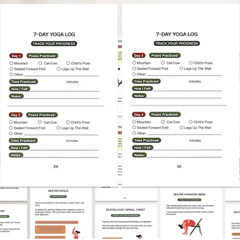 - 30-Day Challenge Plan: Features 18 poses, 3 visual sequences, breathing techniques, and a practice journal for daily progress.