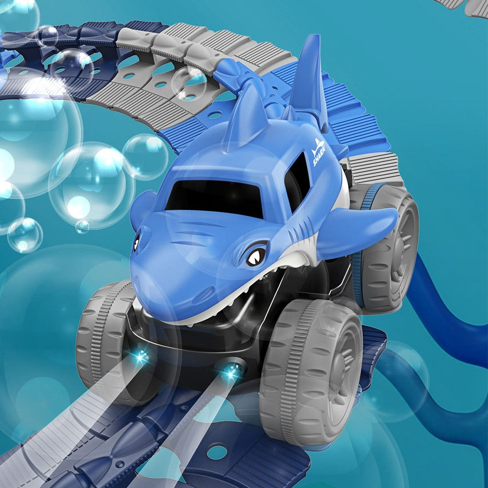 This changeable track shark car toy can enhance kids' creative thinking, fine motor skills and hand-eye coordination.