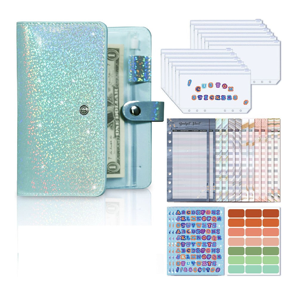 - Smooth glittery PU leather binder cover with 4 card slots, a pen loop, and a snap button closure.