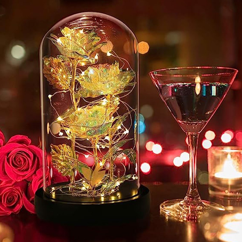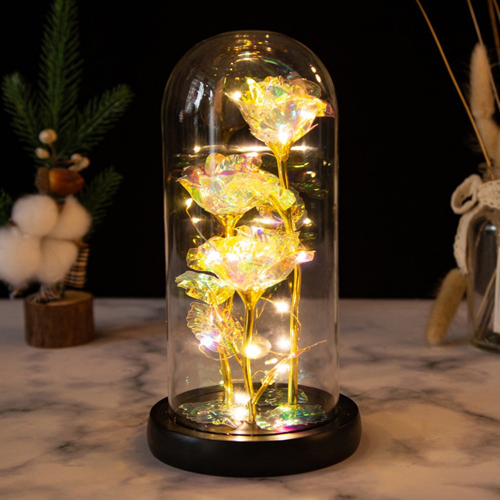 - 3 roses bloom from the base, the compact LED light is embedded in the petals, the bottom switch is turned on, and the lights illuminate the entire glass cover, romantic and charming.
