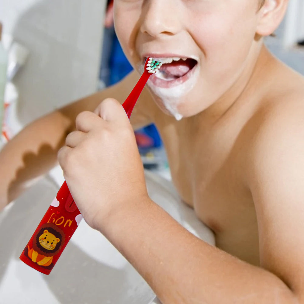 The toothbrush is specially crafted for children aged 3-15 years old, featuring a small, lightweight, and cute design that allows easy one-handed brushing without pressure.