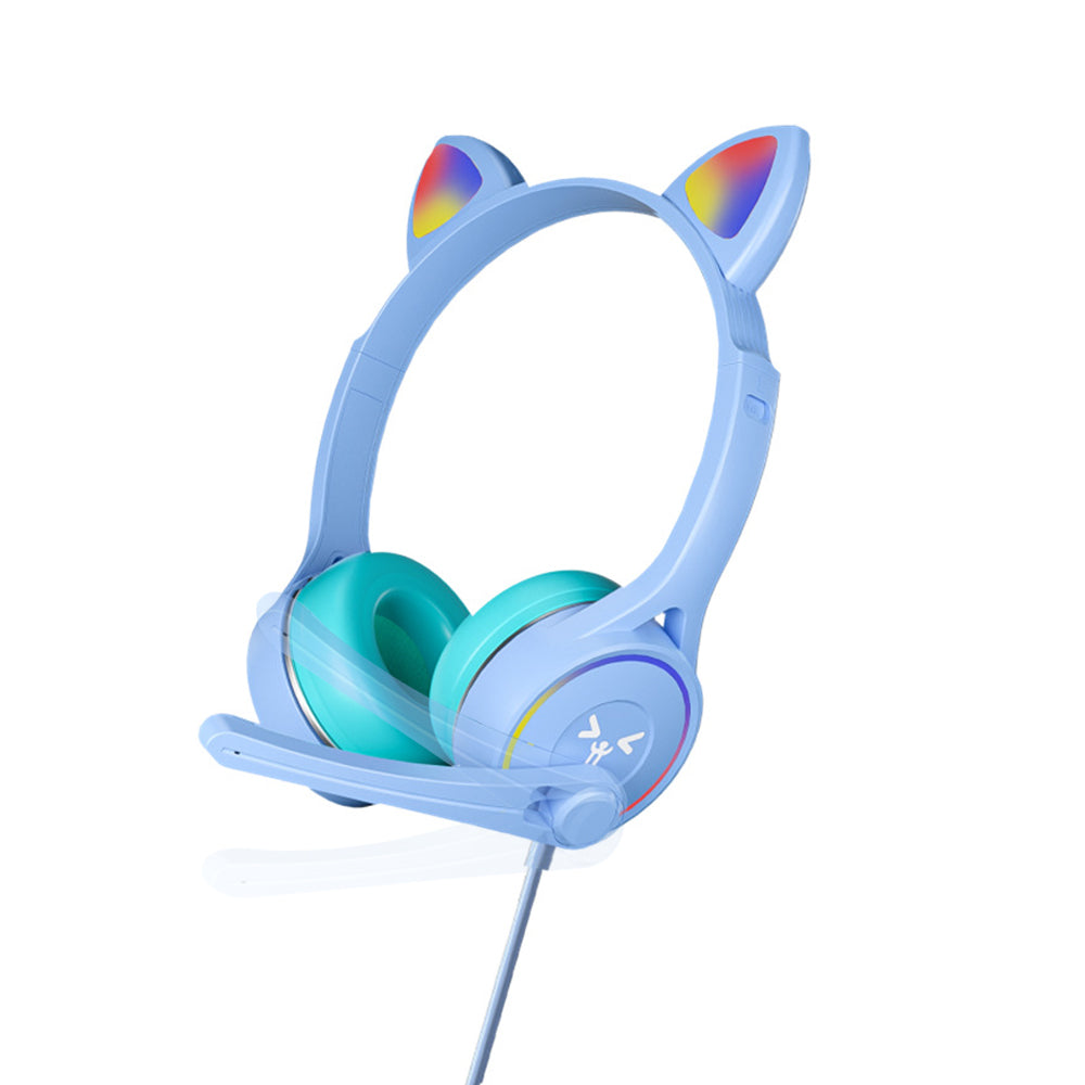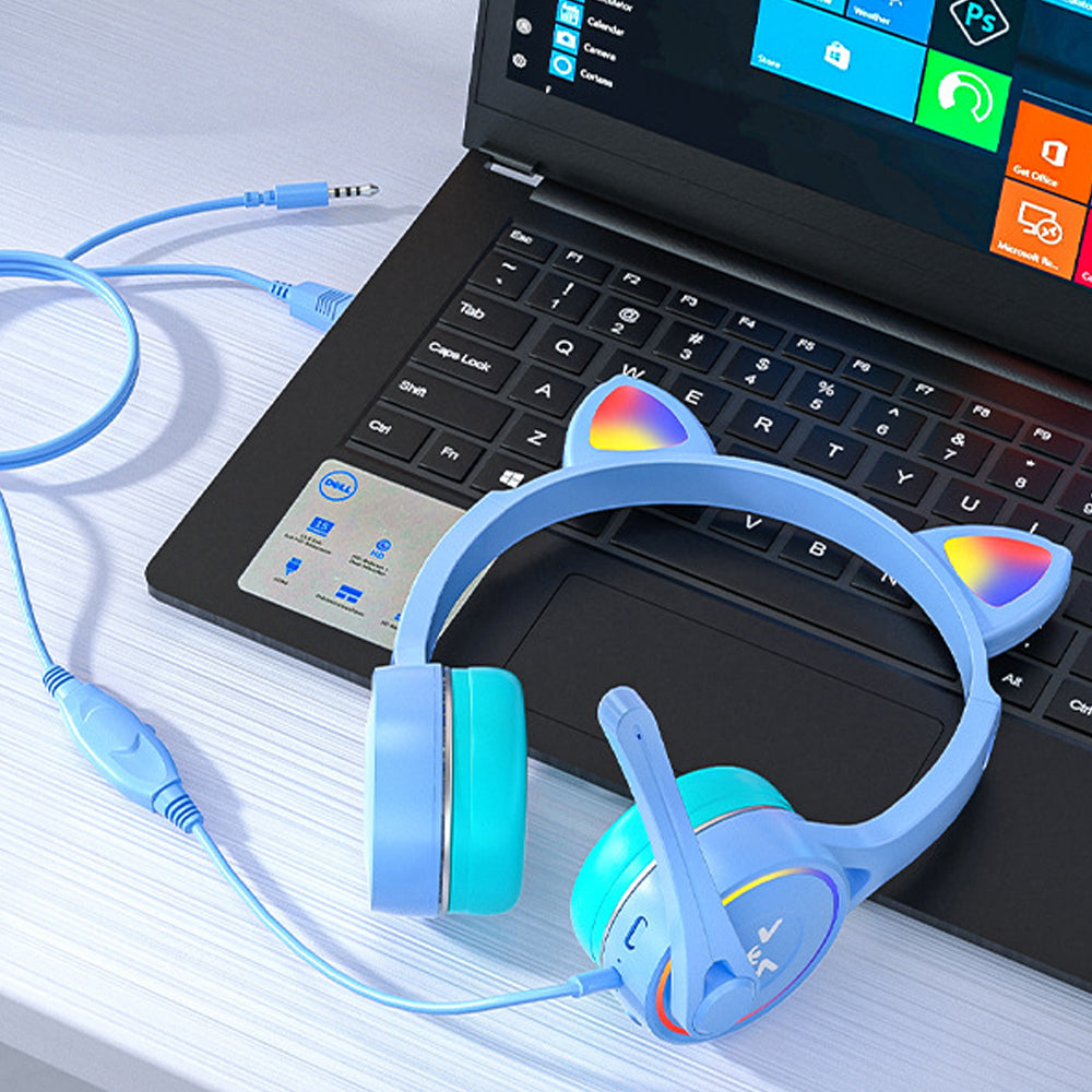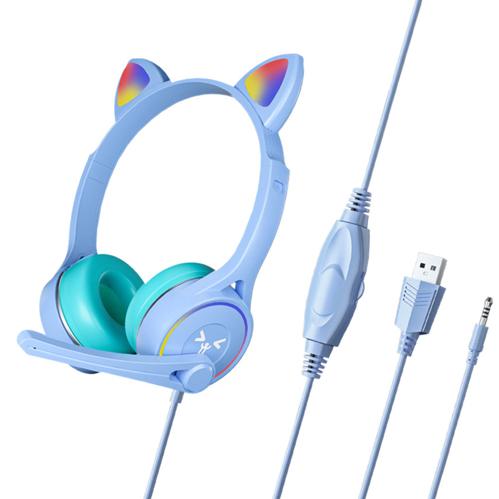 Headworn Headphone for Children Gaming Cat Ear Adjustable Headphones LED Lights Wired Headset Blue