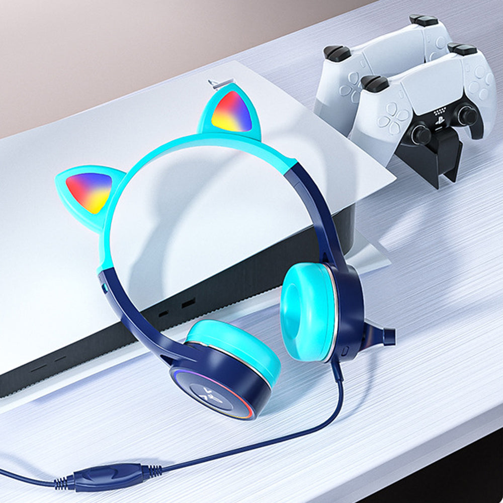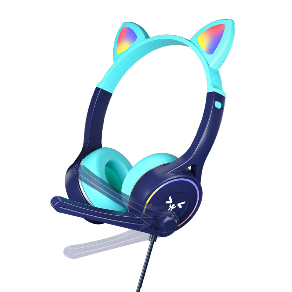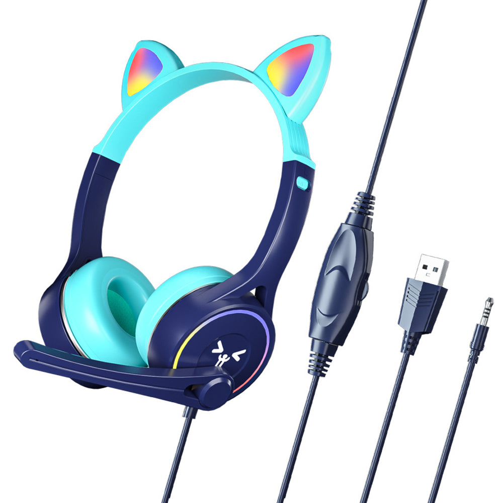 Headworn Headphone for Children Gaming Cat Ear Adjustable Headphones LED Lights Wired Headset Dark Blue