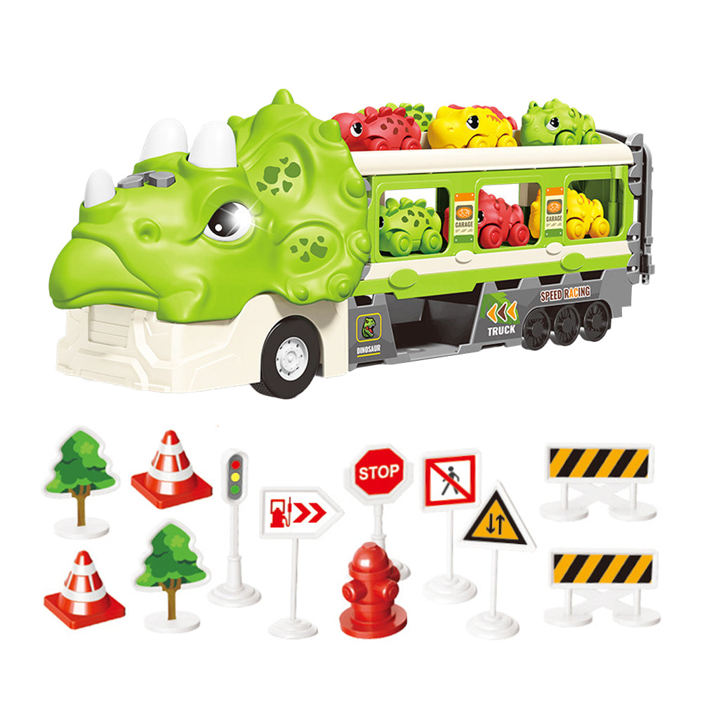 - Set includes a big dinosaur carrier truck, random 6 pcs small dinosaur cars and 12 road signs.