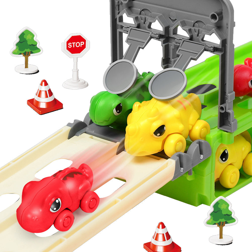 - Ejection racing track design, put the race car in the dinasaur truck toy head launcher position and press the catapult, the little dino car toy will shoot out along the track.