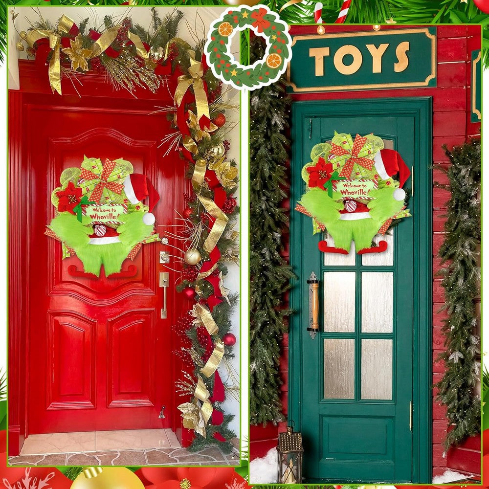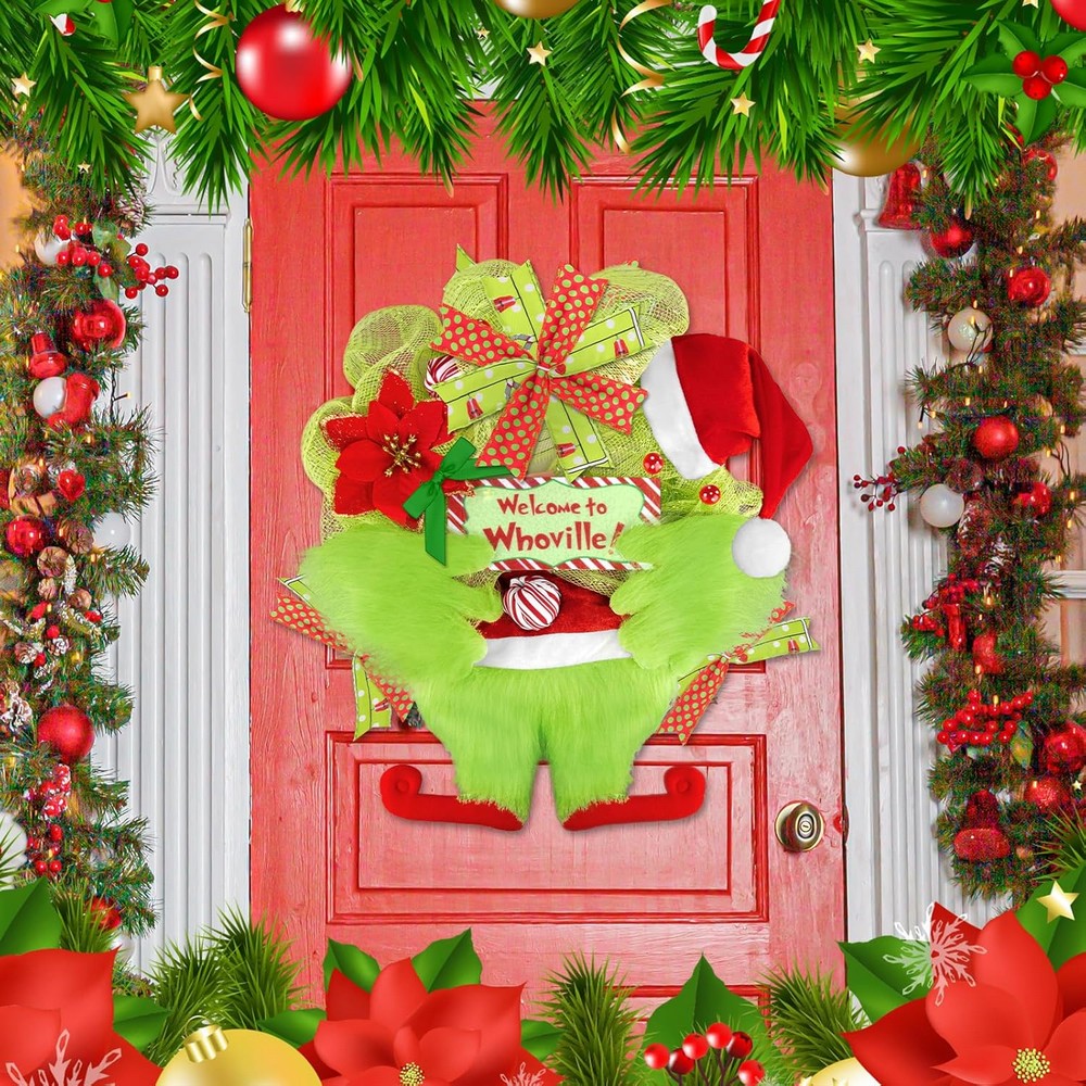 Bring the mischievous spirit of the Grinch to your holiday décor with this vibrant, eye-catching door hanging and wreath set, perfect for spreading festive cheer (or playful Grinchy grumbles!) all season long.