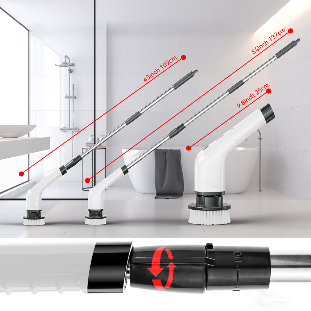 - This shower spin scrubber equipped with extendable stainless-steel handle which extends from 27cm to 130cm, easy to clean hard-reach places, without kneeling or bending over.