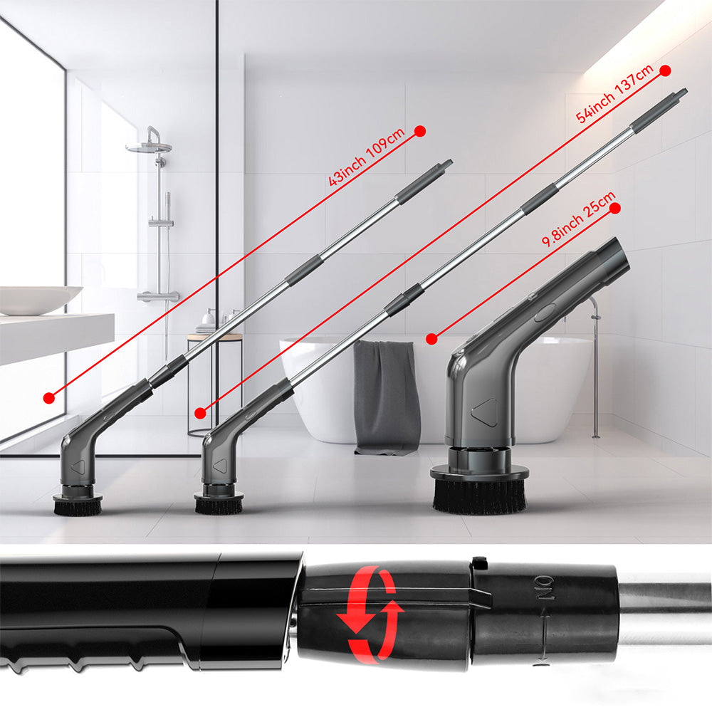 - This shower spin scrubber equipped with extendable stainless-steel handle which extends from 27cm to 130cm, easy to clean hard-reach places, without kneeling or bending over.