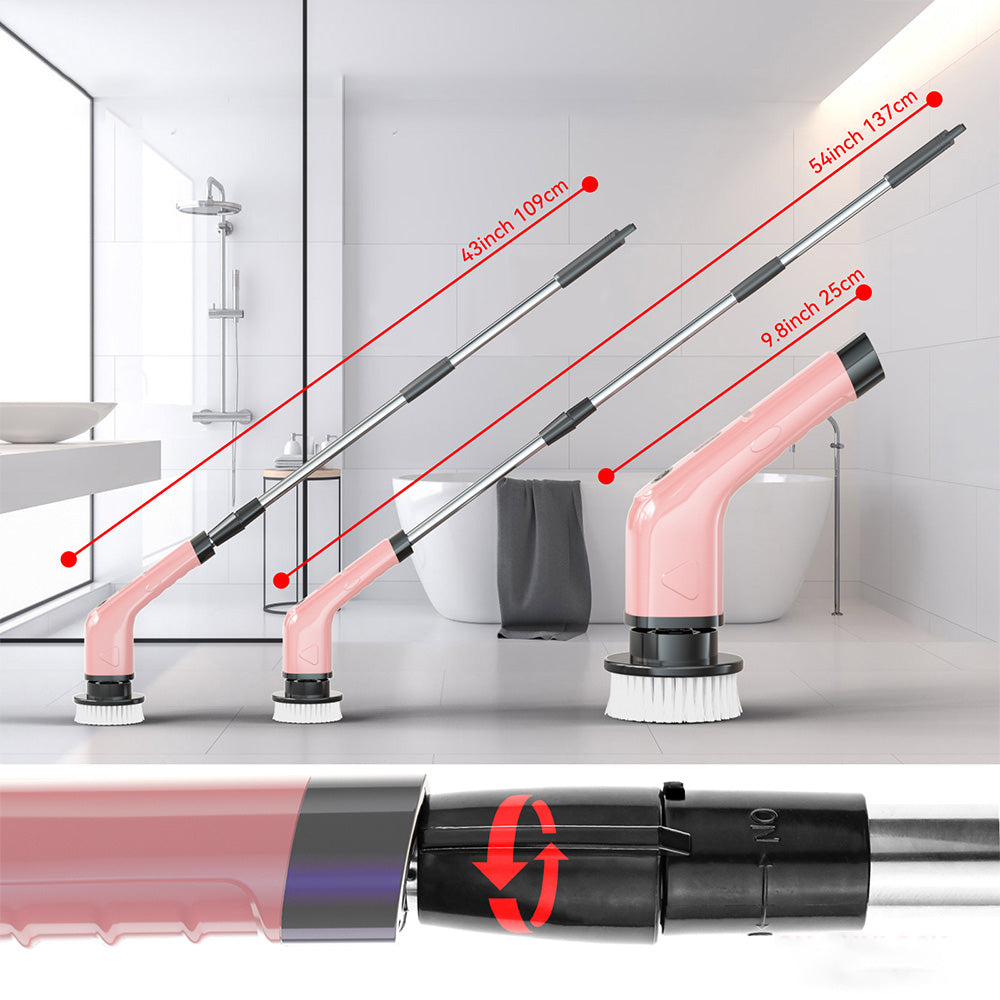 - This shower spin scrubber equipped with extendable stainless-steel handle which extends from 27cm to 130cm, easy to clean hard-reach places, without kneeling or bending over.