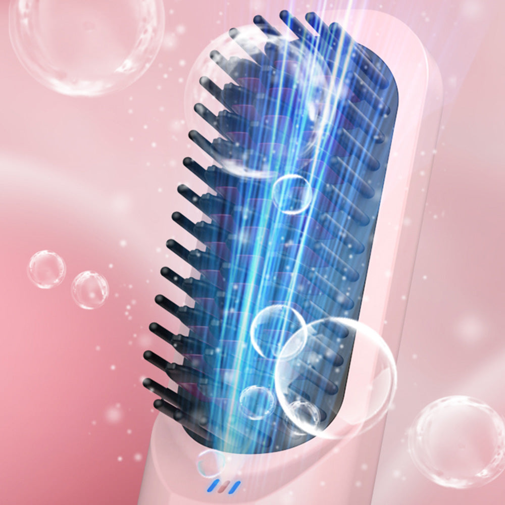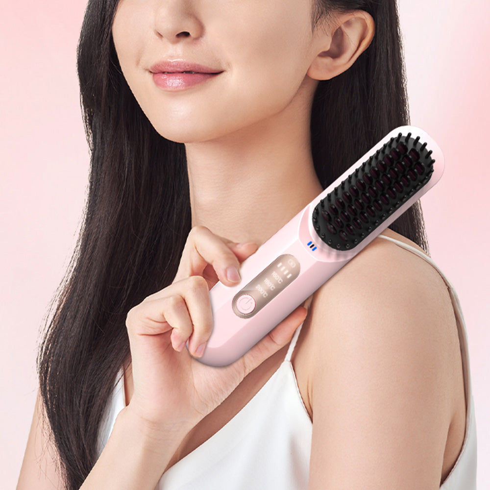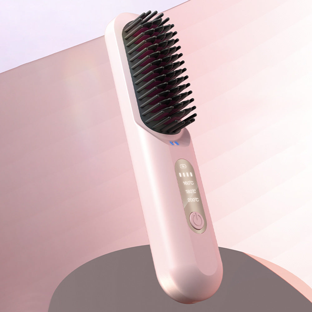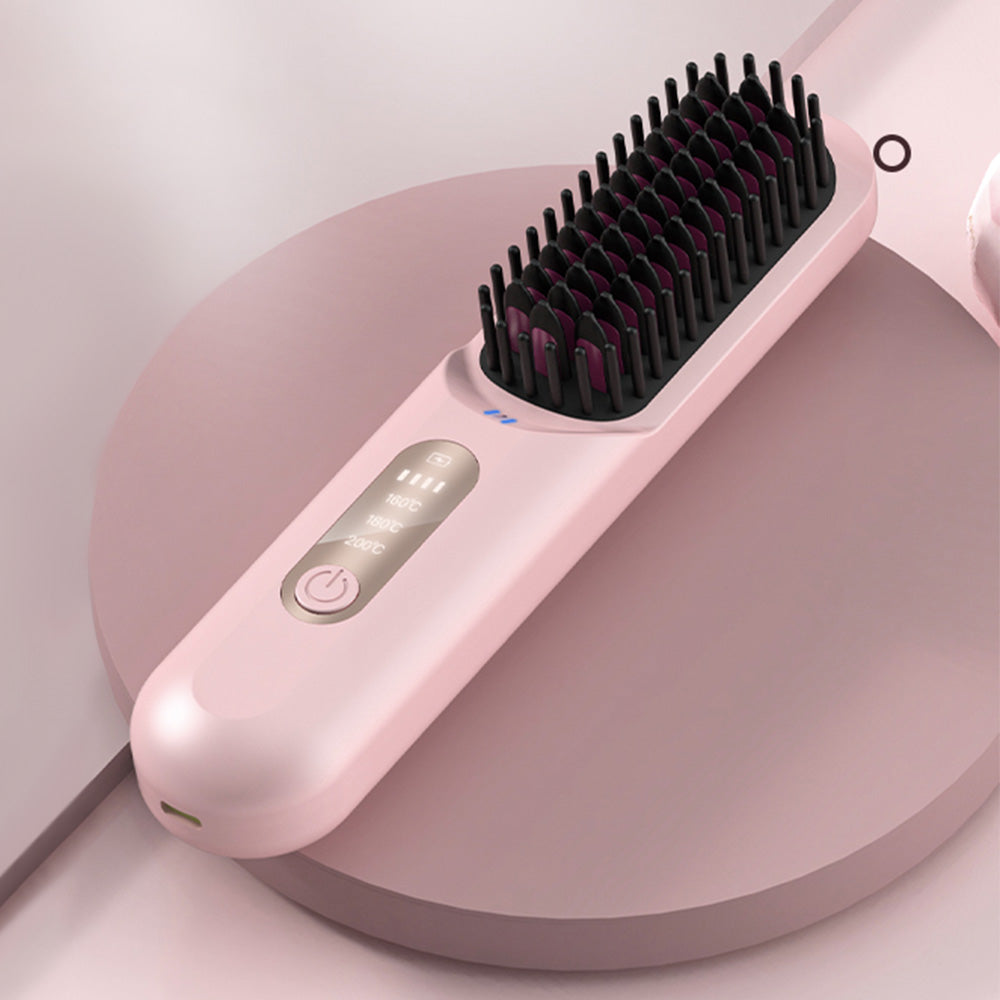 Cordless Hair Straightener Brush Mini Anion Hot Straightener Comb with LED Display Pink