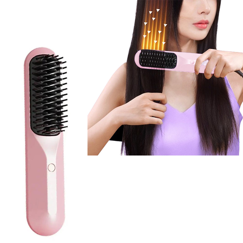 Cordless Hair Straightener Brush Portable Negative Ion Heating Hair Straightening Comb on-The-go Pink