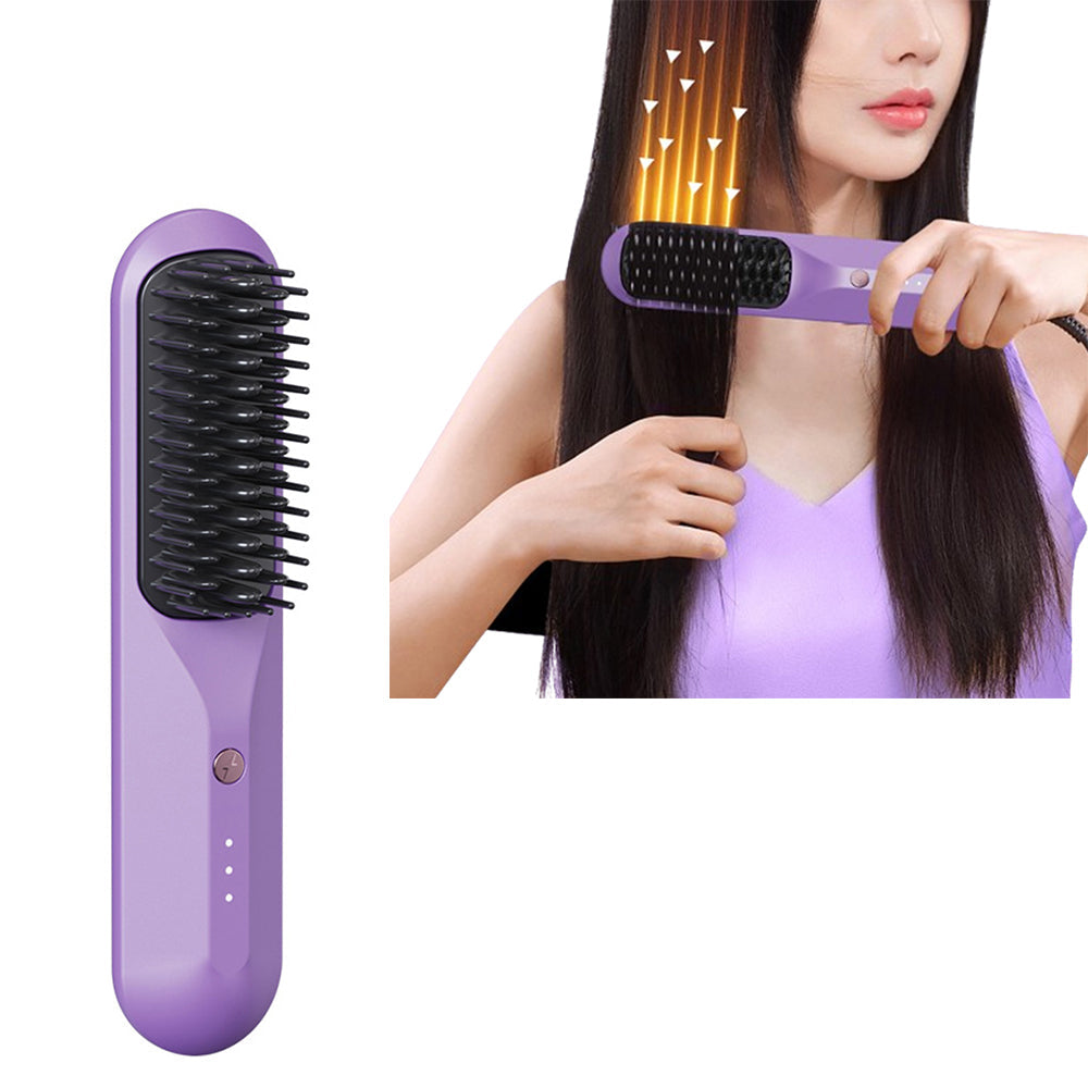 Cordless Hair Straightener Brush Portable Negative Ion Heating Hair Straightening Comb on-The-go Purple
