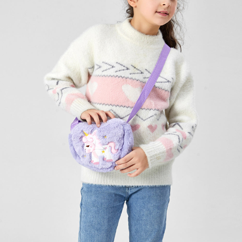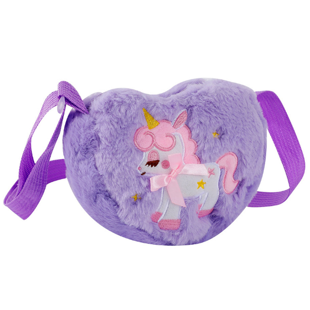 Cute Plush Unicorn Crossbody Bag Heart Shape Zipper Shoulder Bag for Girls Purple