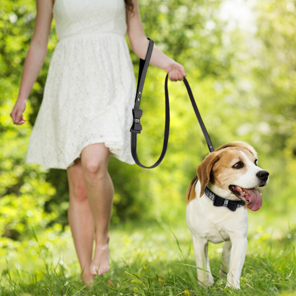 Stylish and comfortable dazzling embellishments pet collar and leash set, featuring a bow with soft microfiber fabric, and durable zinc alloy hardware.?