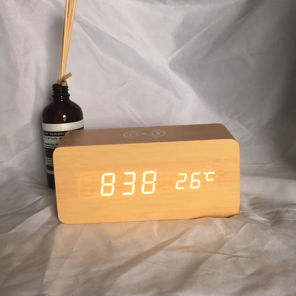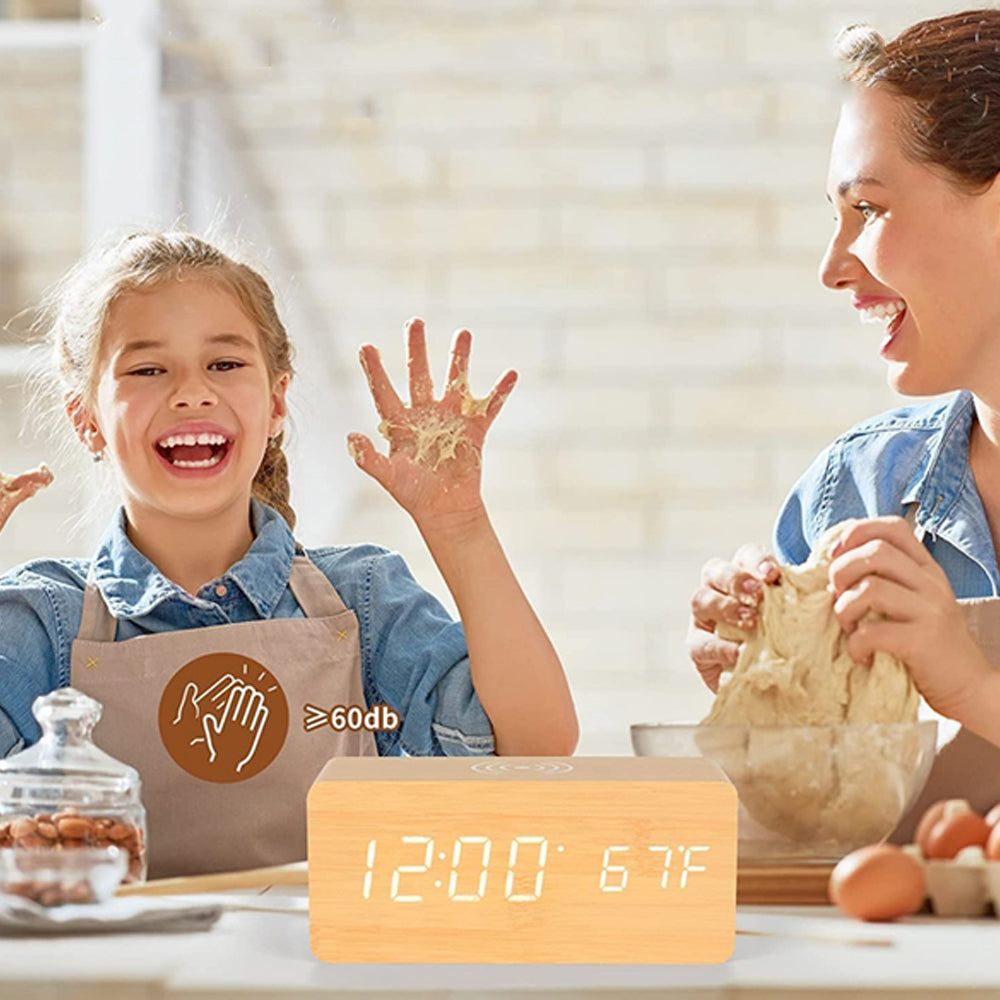 Dimmable Digital Alarm Clock with Wireless Charger Station for Home Office Wood