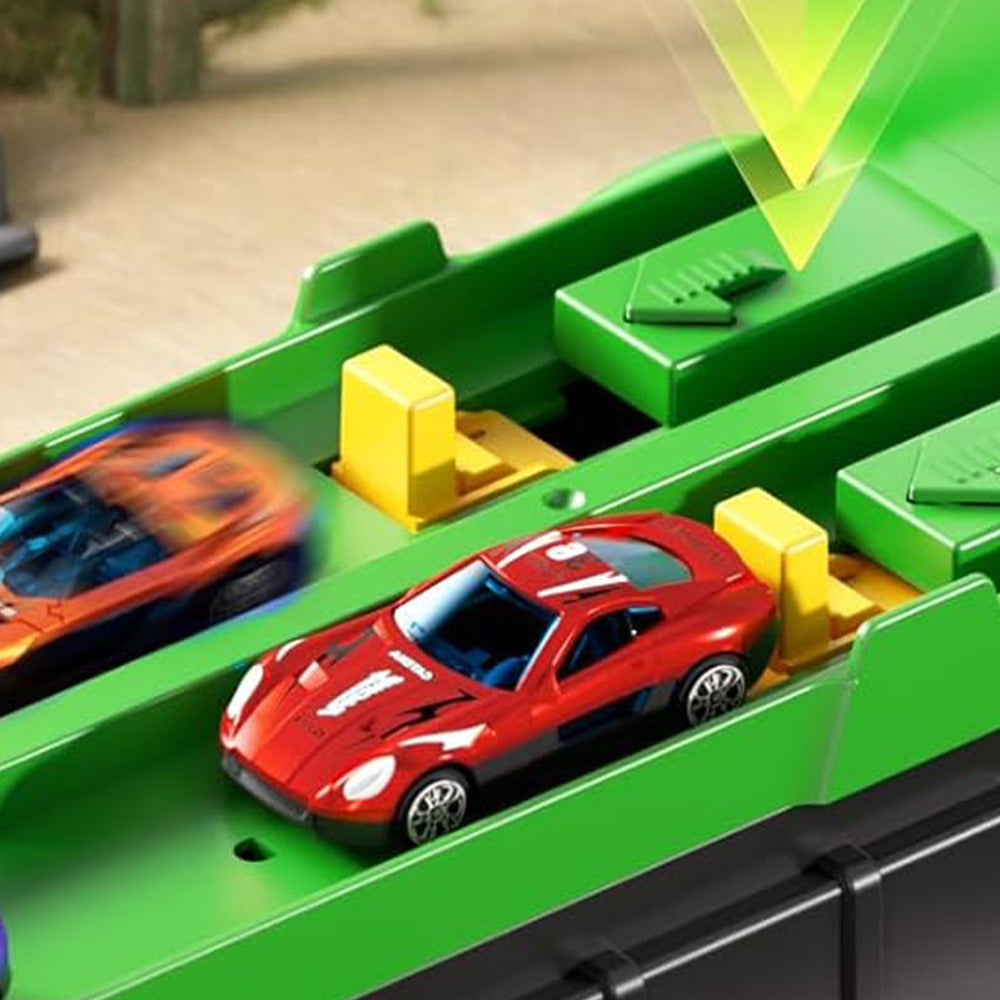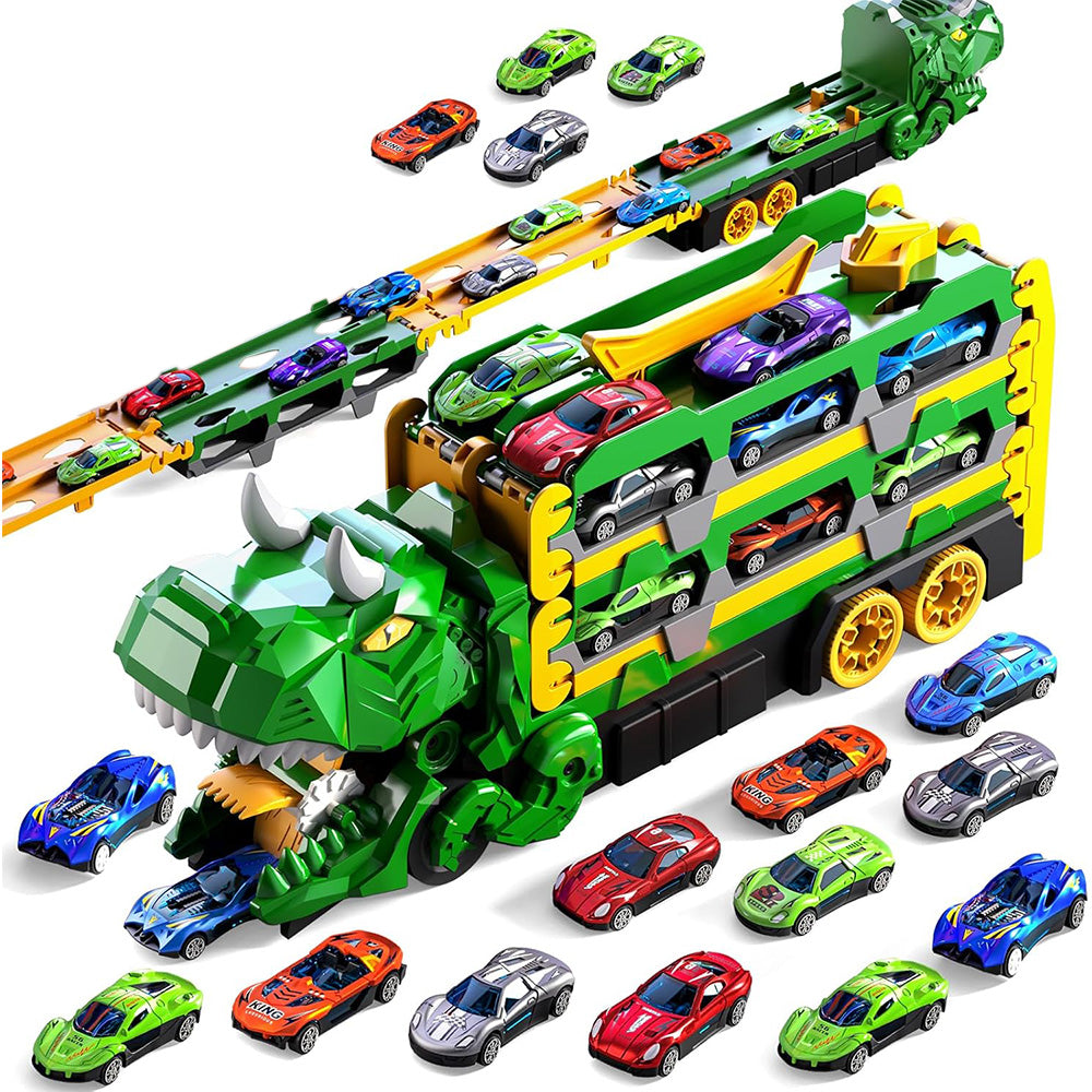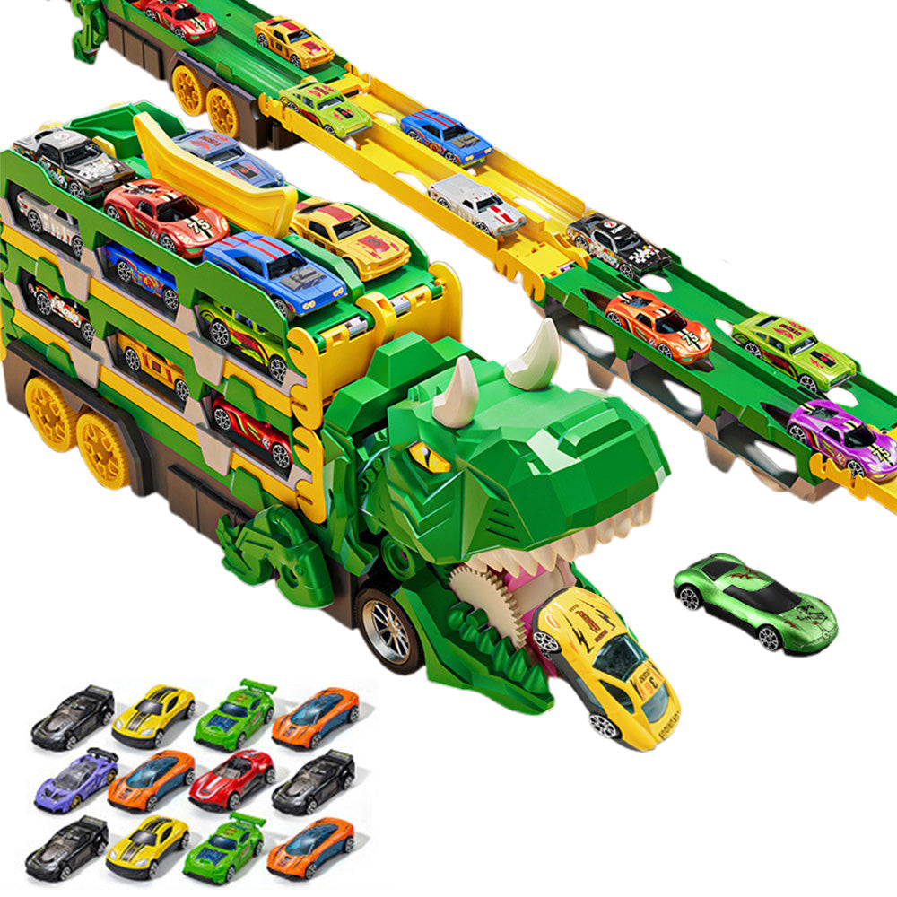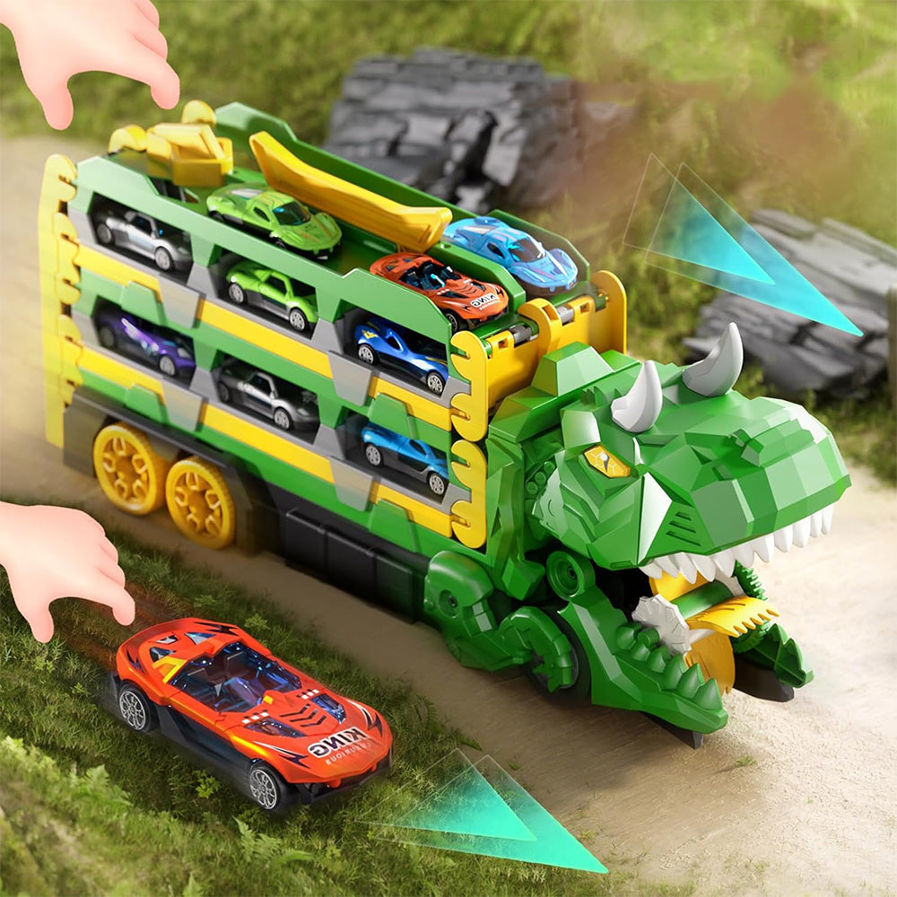- Roll this dinosaur transport vehicle by hand to simulate swallowing up to four metal cars, and the cars can then slide out from the rear hatch, mimicking an escape action, providing children with thrilling and engaging playtime.