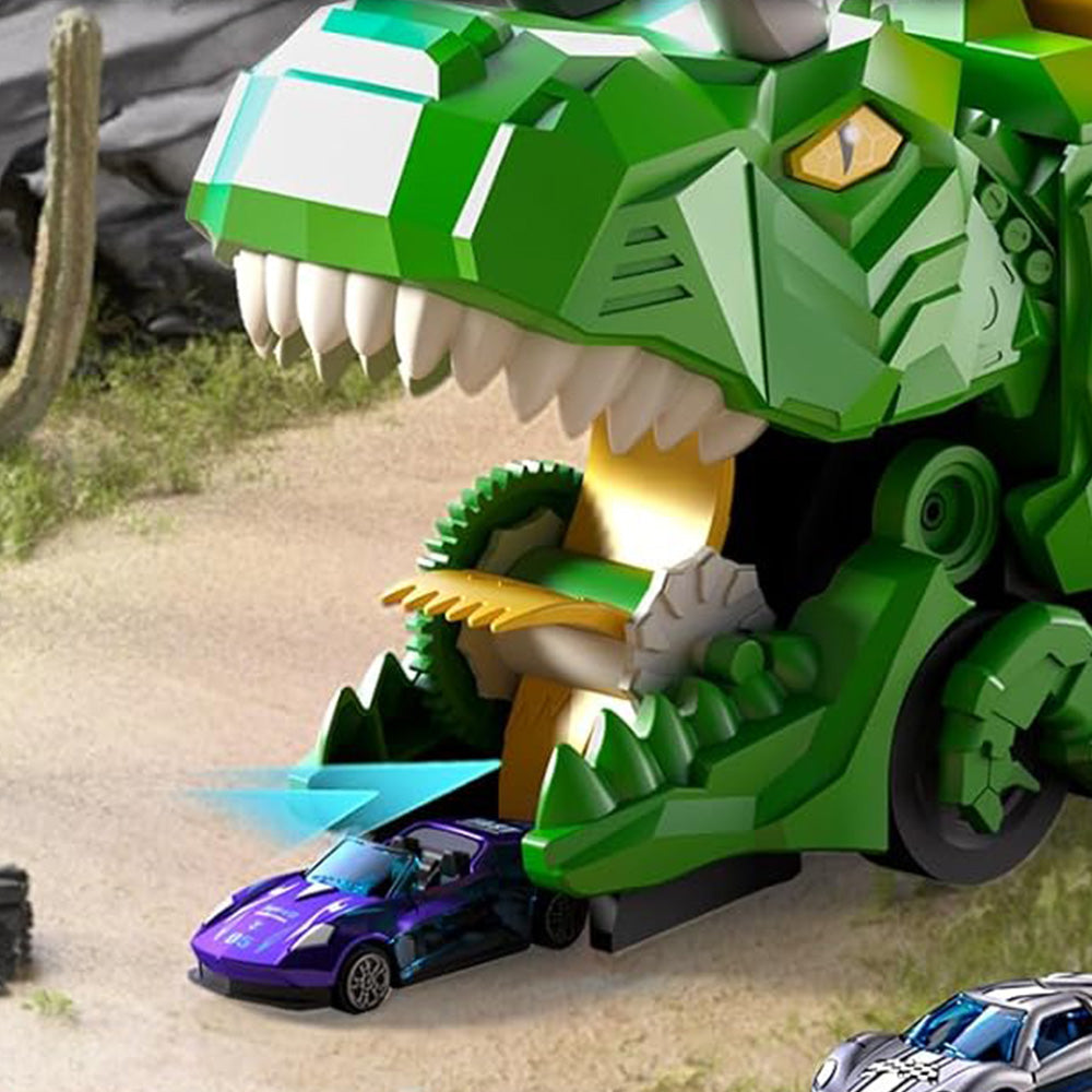 This dinosaur toy combines car swallowing, dinosaur transformation, and storage capabilities, boys can enjoy the fun of a dinosaur swallowing cars, transform it into a standing dinosaur, and utilize the sliding track.