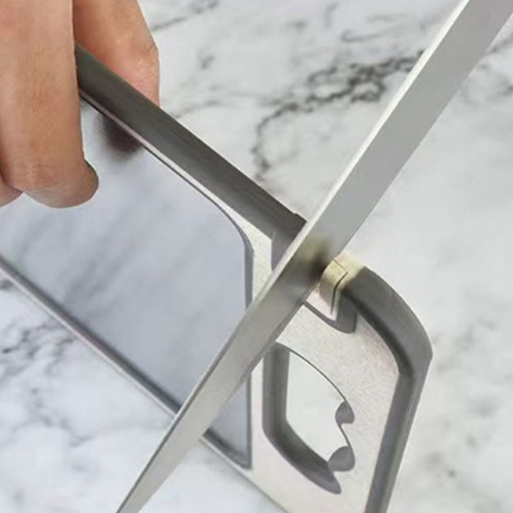 - The cutting board has a sharpener on the side to facilitates daily knife cleaning and care.
