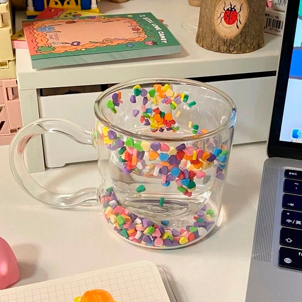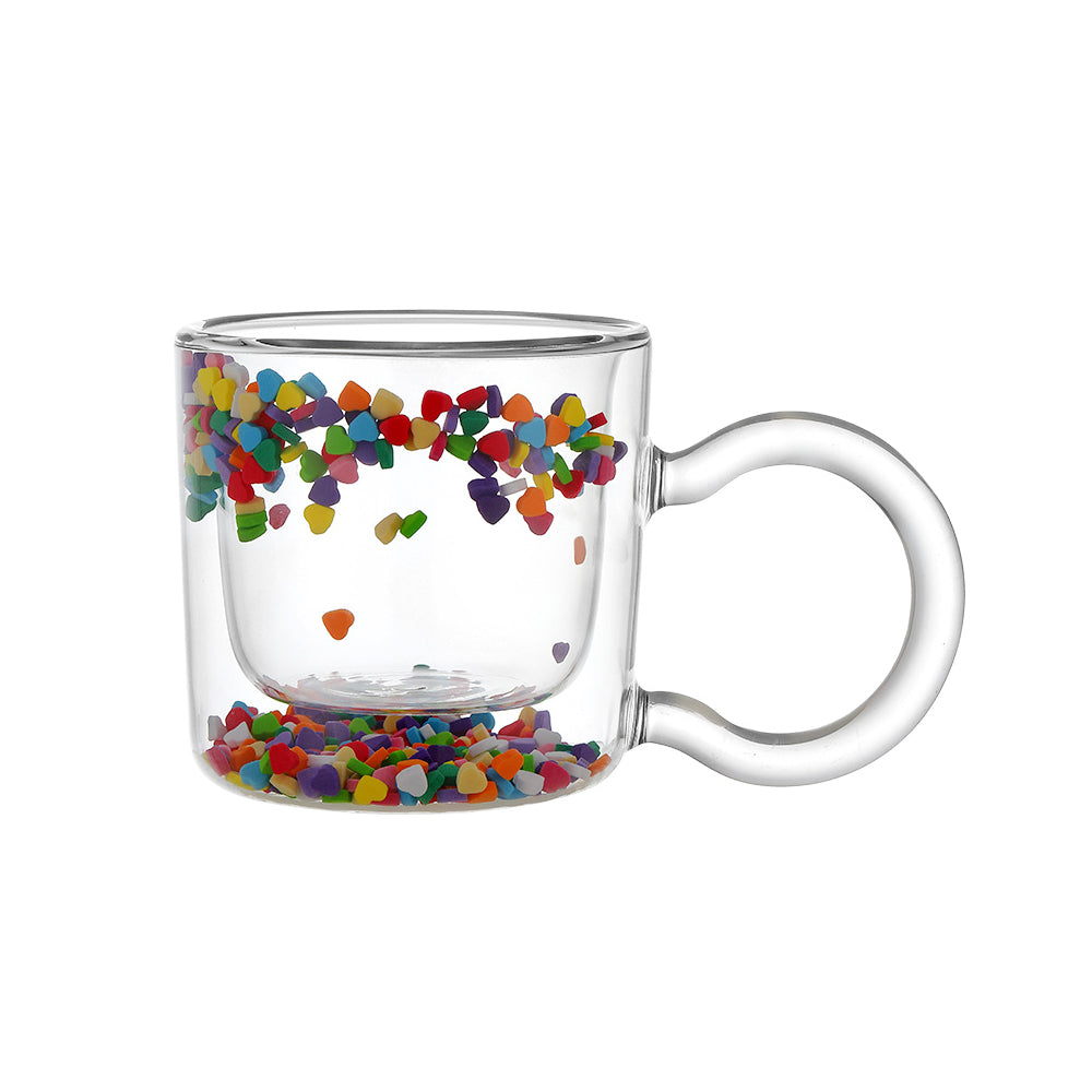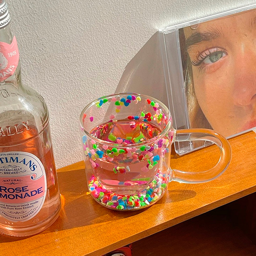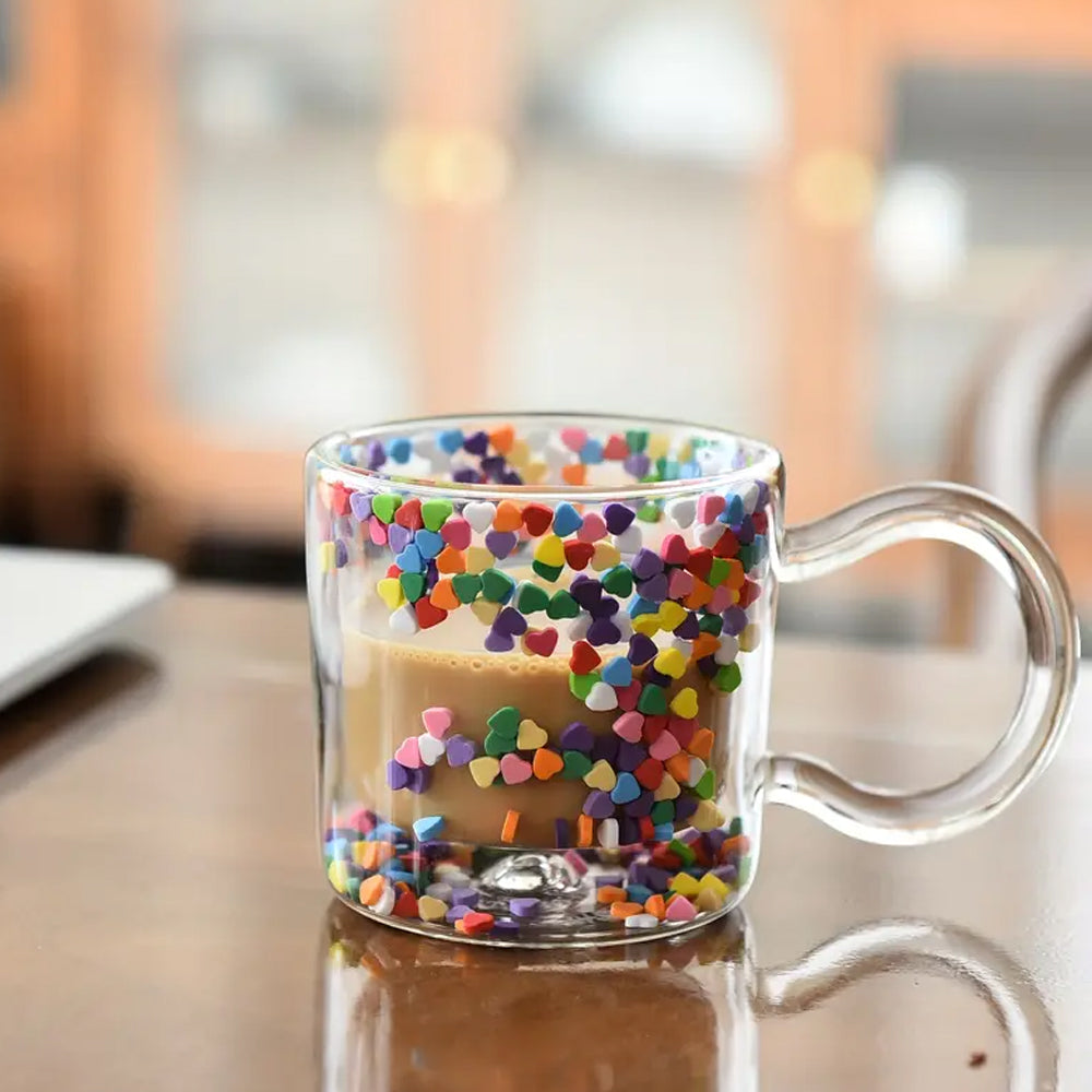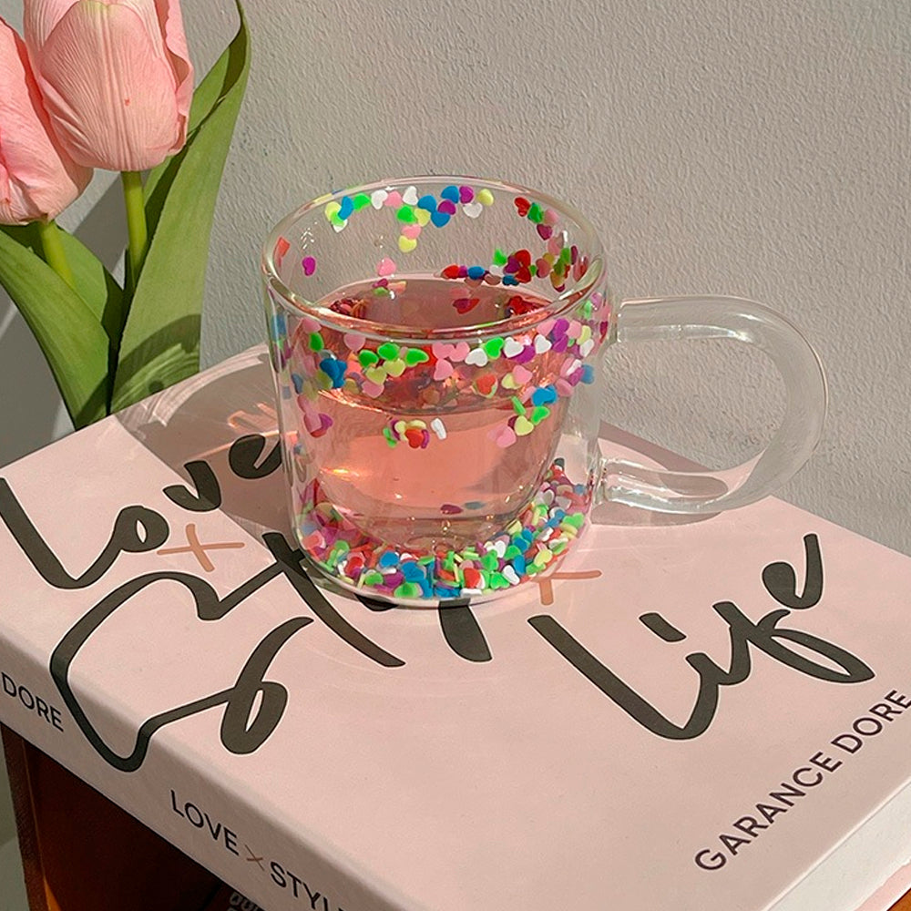 This glass features a distinctive and visually appealing design, with delicate and vibrant heart particles suspended within the cup, creating a visually captivating experience.