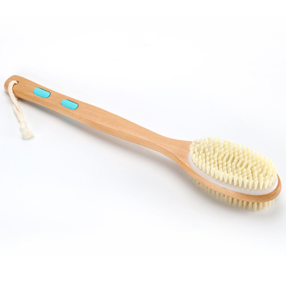 Dual-texture long-handled bath brush with natural wood handle and soft bristles for thorough and comfortable body cleaning.