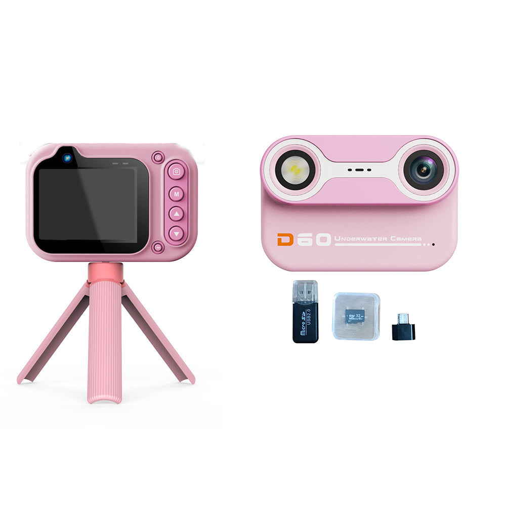 Dual-Lens Kids Underwater 10X Zoom Digital Camera Waterproof Action Camera with 32GB TF Card Pink