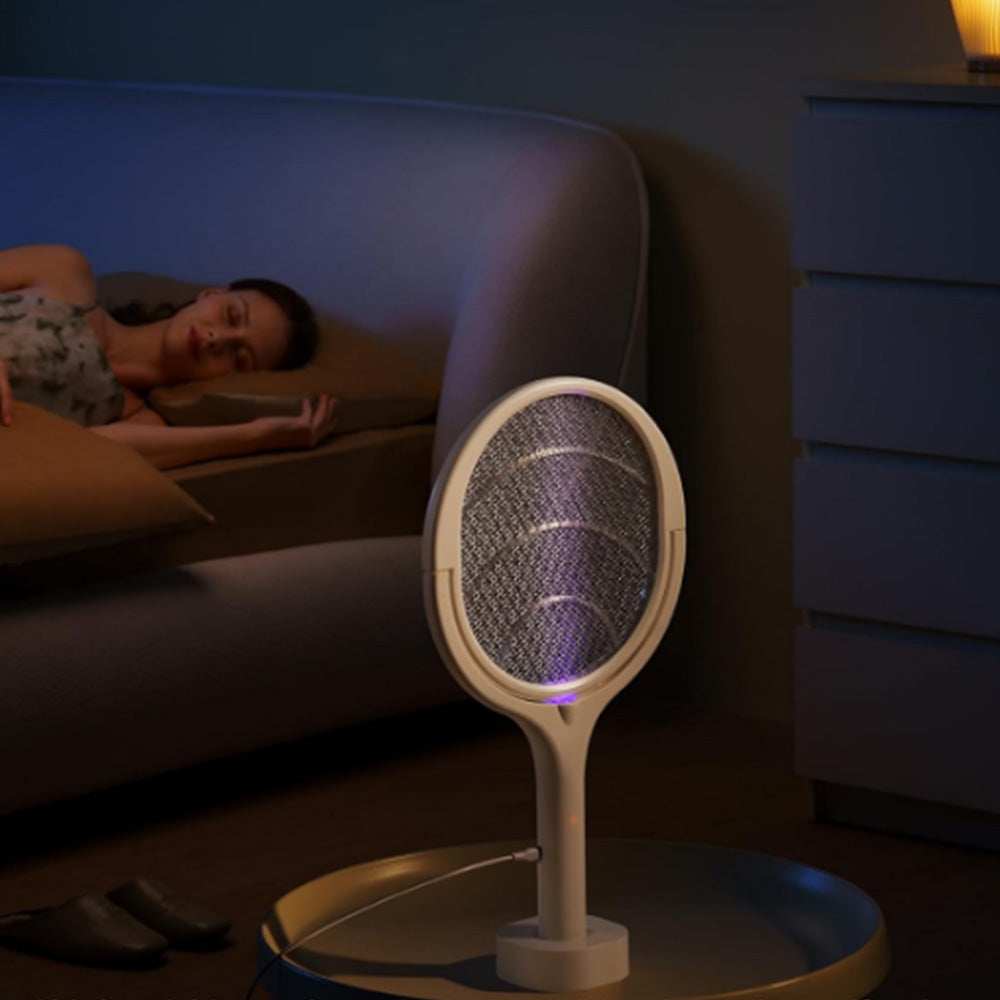 A fly swatter with an attractive light feature, convenient storage base, and wall-mountable design for added flexibility.