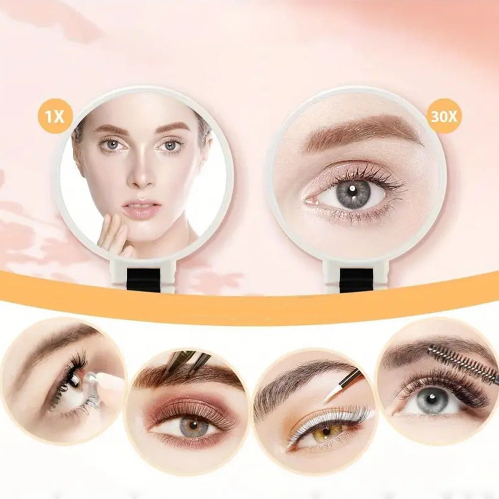 - The magnifying mirror features 1x magnification on one side and 30x on the other. The 1x side is a high-definition personal mirror for daily using. The other side 30x magnifying mirror show face's pores, facial hair, small blackheads, pimples, wrinkles and makeup imperfections.