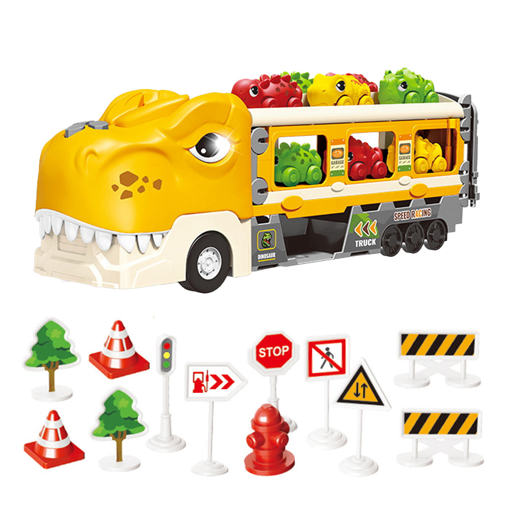 - Set includes a big dinosaur carrier truck, random 6 pcs small dinosaur cars and 12 road signs.