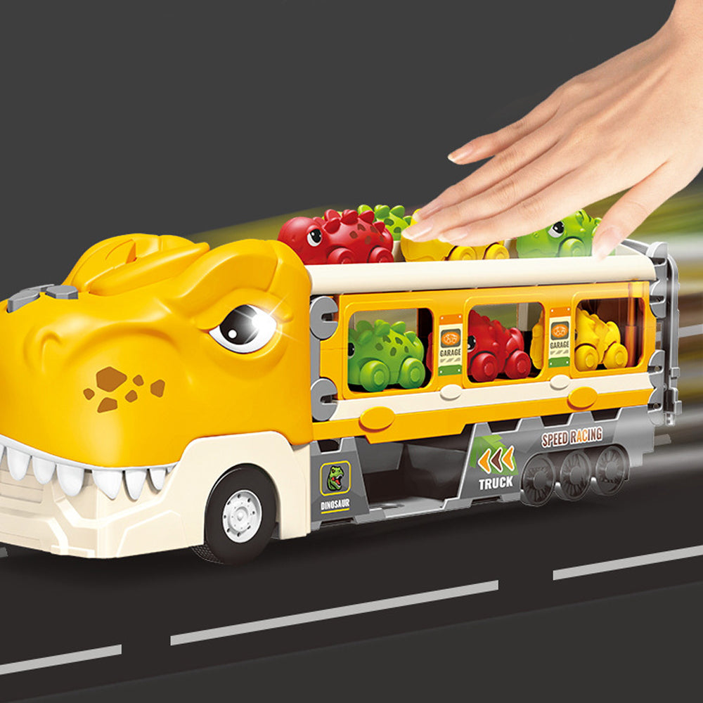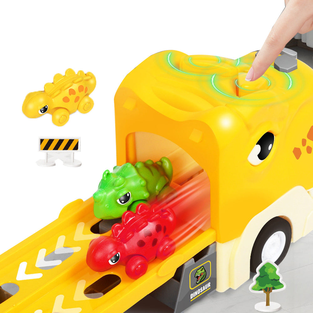 - Ejection racing track design, put the race car in the dinasaur truck toy head launcher position and press the catapult, the little dino car toy will shoot out along the track.