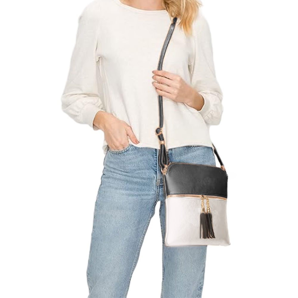 Girls Crossbody Bag Shoulder Bag with Tassel and Zipper Pocket Black and White