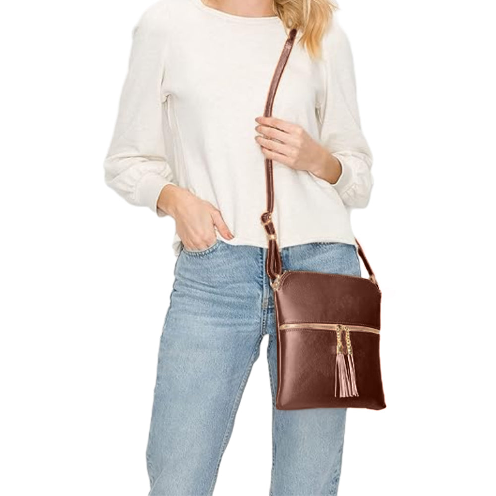 Girls Crossbody Bag Shoulder Bag with Tassel and Zipper Pocket Brown