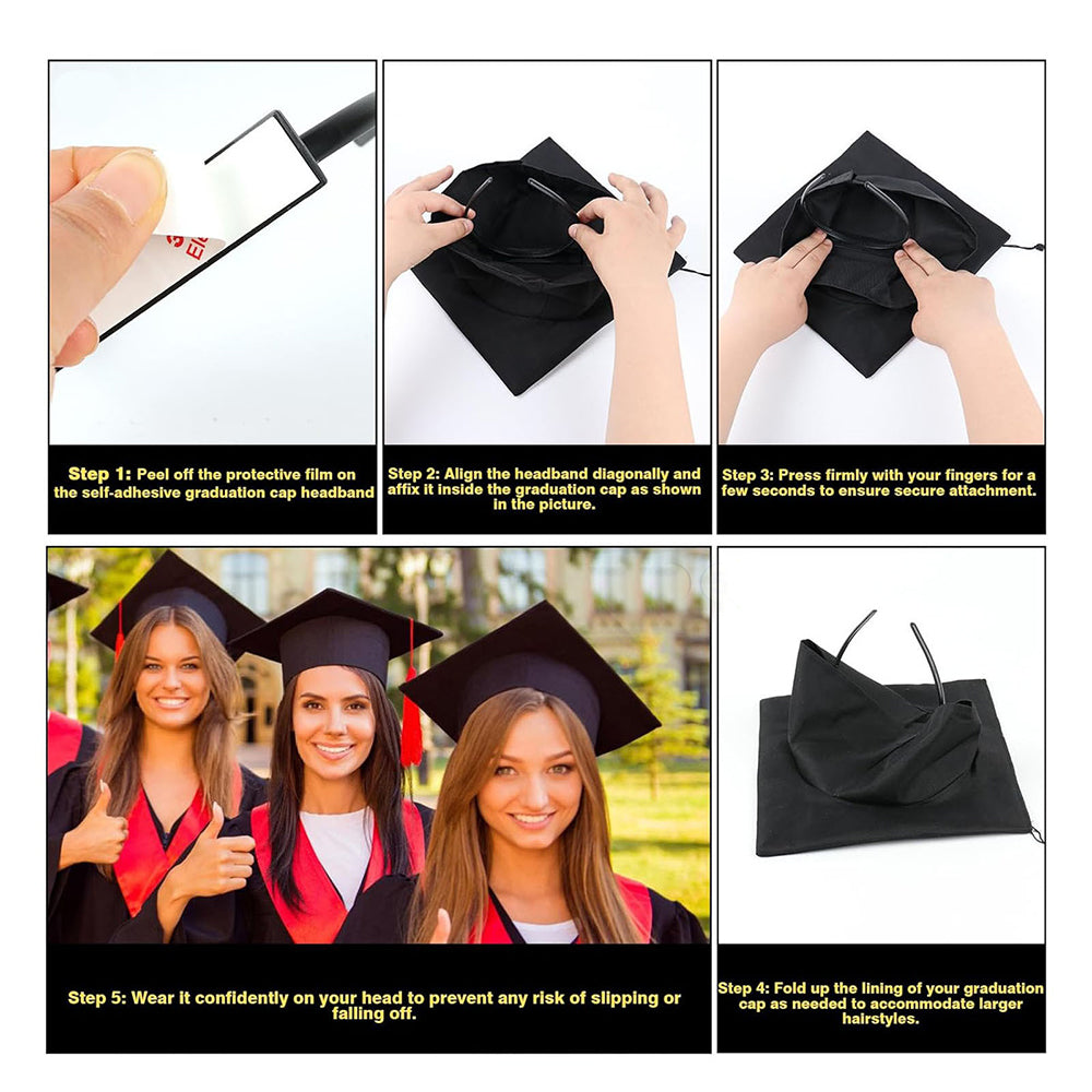 - It has a large double-sided strong adhesive, peel it off, press, and hold for a few seconds, The cap headband insert can be firmly fixed inside your graduation cap.