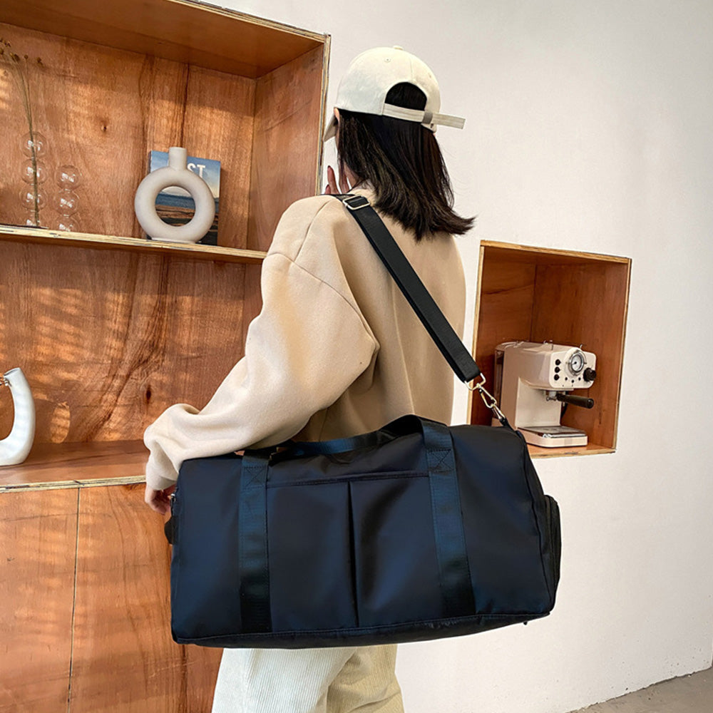 - Spacious design includes a layered main compartment, wet and dry separation pocket, front storage pocket, zippered side pocket, and independent shoe compartment.