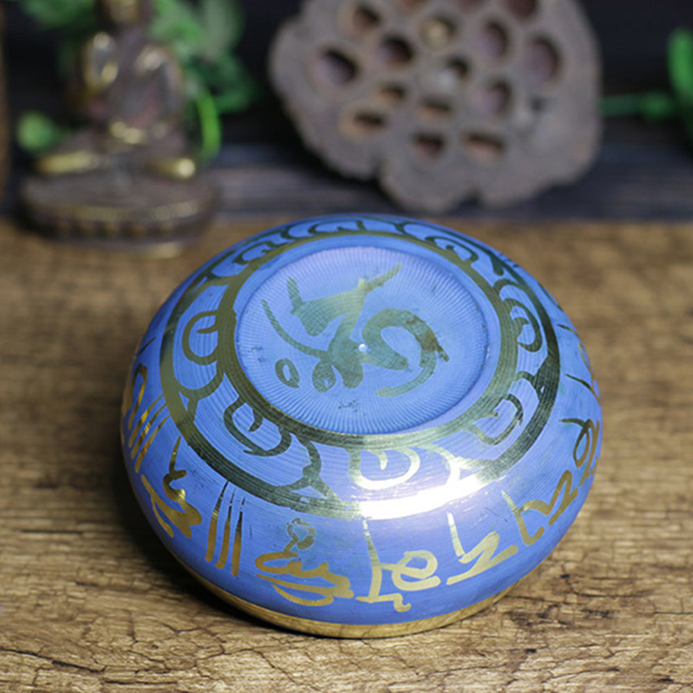 The bowl with its gold rim and embossed bottom design, it is very solemn and beautiful. It makes sound by rubbing wood sticks, helping to better meditate and heal the mind