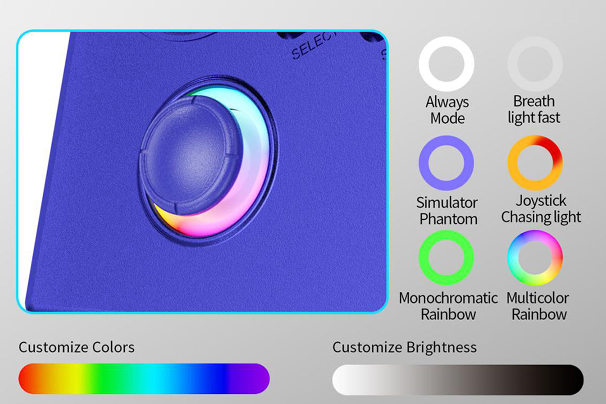 - RGB lighting effect: 16 million color RGB joystick lighting, support constant light, breath, rainbow, marquee, chasing, gaming and other light effects, support customize the color and adjust the brightness.